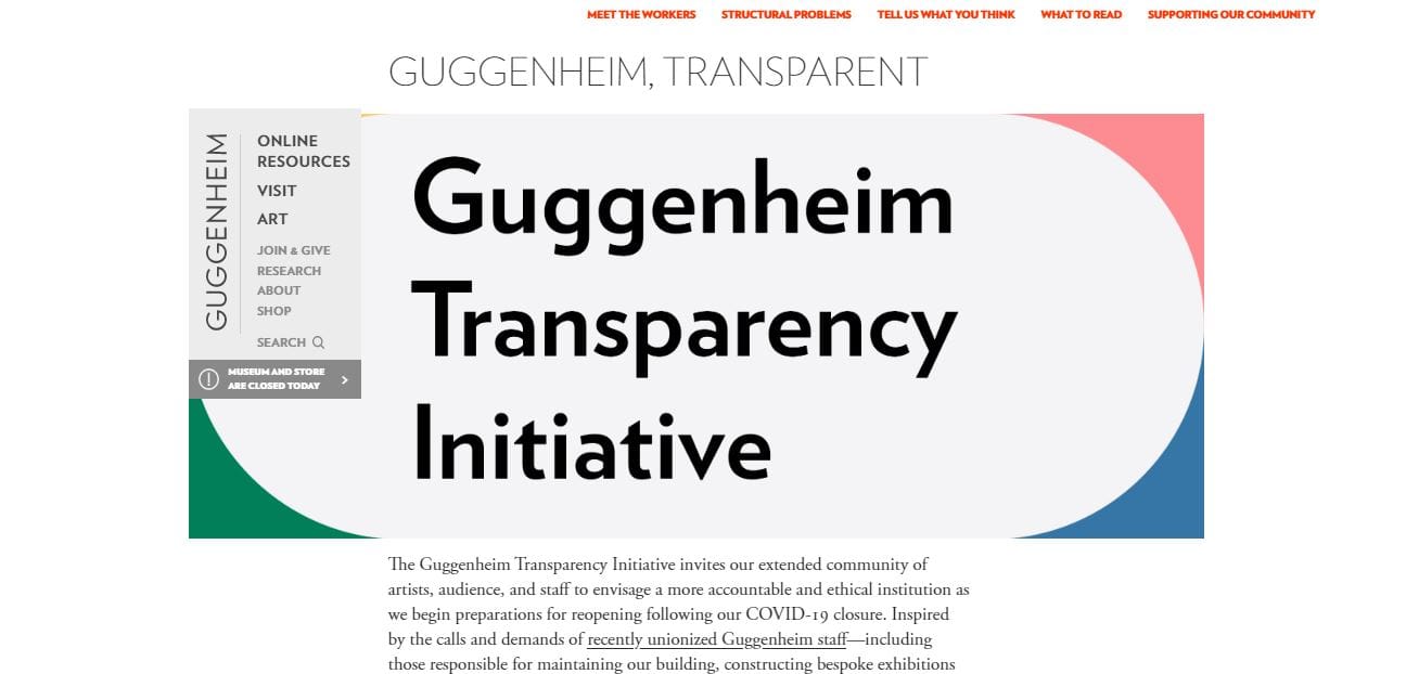 Written from the perspective of the Guggenheim, the campaign “invites our extended community of artists, audience, and staff to envisage a more accountable and ethical institution as we begin preparations for reopening following our COVID-19 closure.”