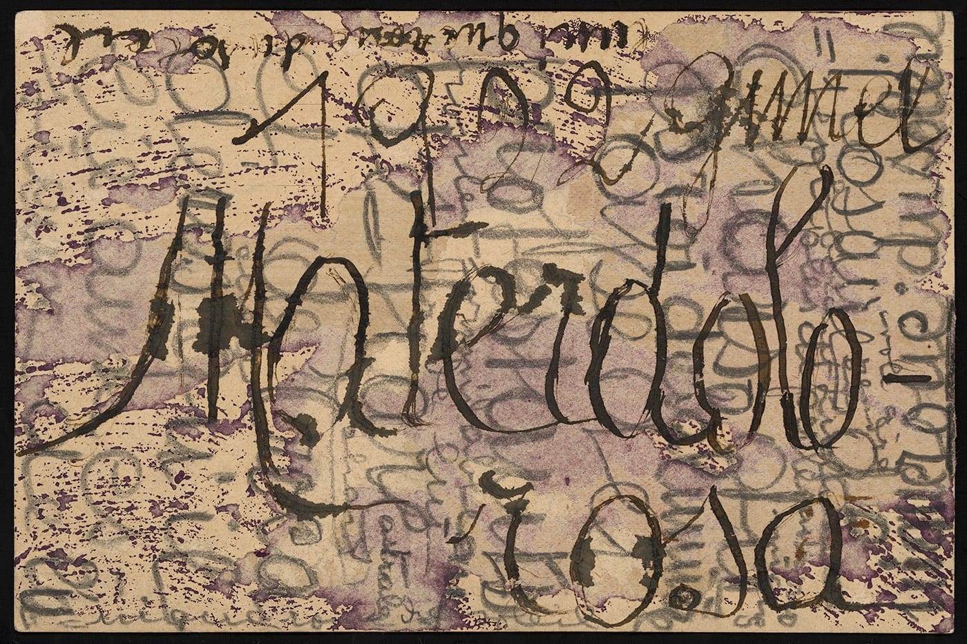 Scrivere Disegnando cites the well-known Swiss art brut creator Aloïse Corbaz (1886-1964), who is best known for colorful fantasy images of the court of Wilhelm II, the last German emperor. Here, though, from the Collection de l’Art Brut’s vault comes “Materdolorosa” (1922), an extraordinary ink-on-paper writing-drawing that would feel right at home alongside the experiments in automatism by the Surrealists or certain American modernists on the road to full-blown Abstract Expressionism.
