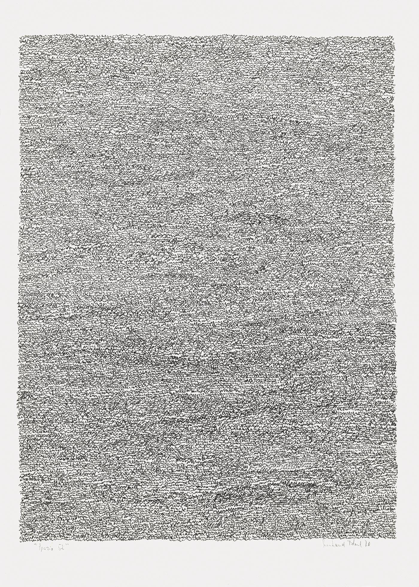 Scrivere Disegnando also examines drawings made by the German artist Irma Blank (born 1934 and based in Italy). Blank is known for her Eigenschriften (1968-72), a series of drawings whose title means “unique scripts” or “private scripts” and consists of sheets covered with dense lines of scrawl without any discernible meaning. The gesture of their making is their elusive semantic value.