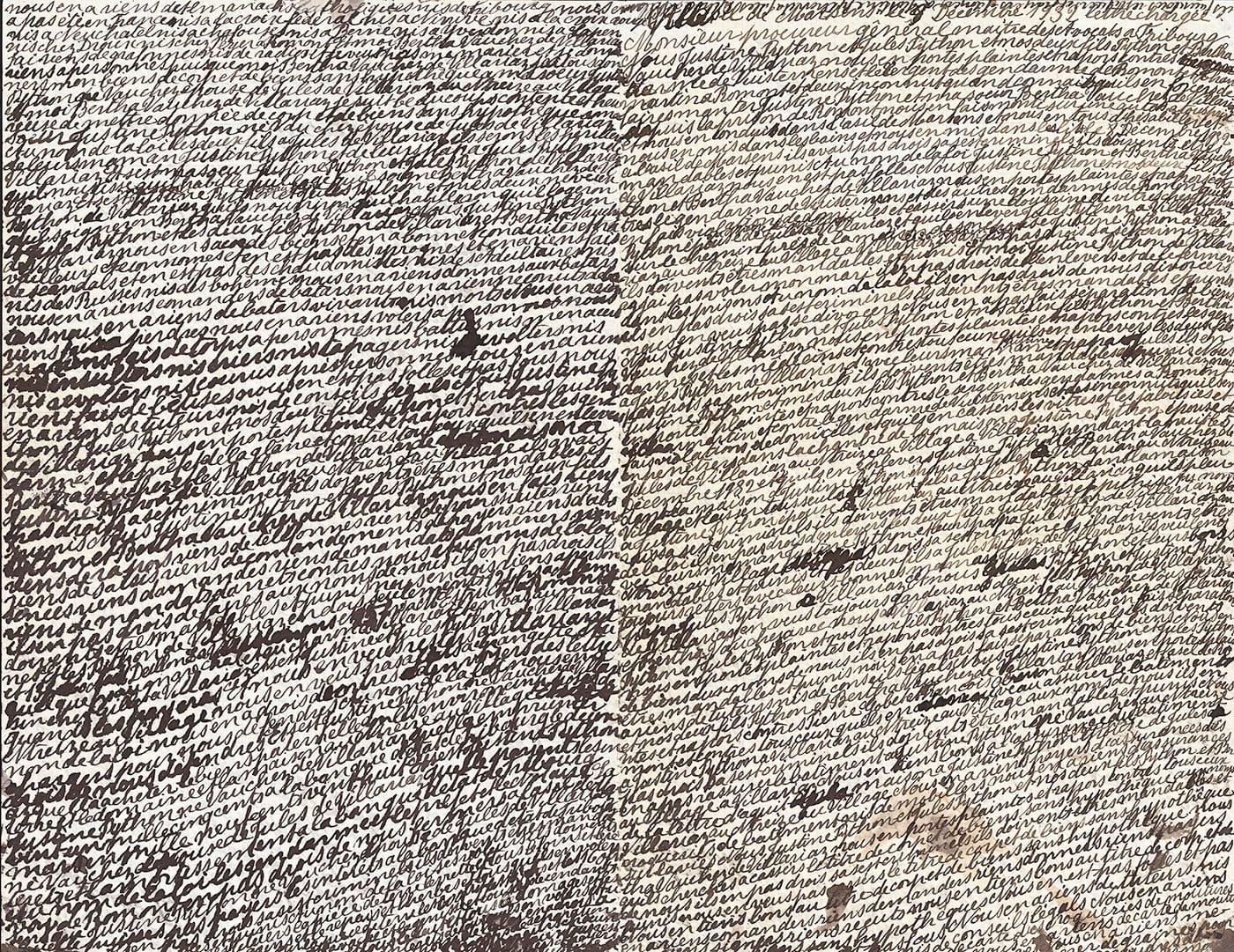 Like Blank’s Eigenschriften, the peculiar letter-drawings of Justine Python, a Swiss woman who was born in 1879 and whose death date is unknown, cover sheets of paper with densely packed lines of handwriting. They recall the horror vacui, or fear of empty spaces, that characterized the artistic creations of psychotic patients in European psychiatric hospitals, which pioneering researchers examined and attempted to analyze roughly a century ago.