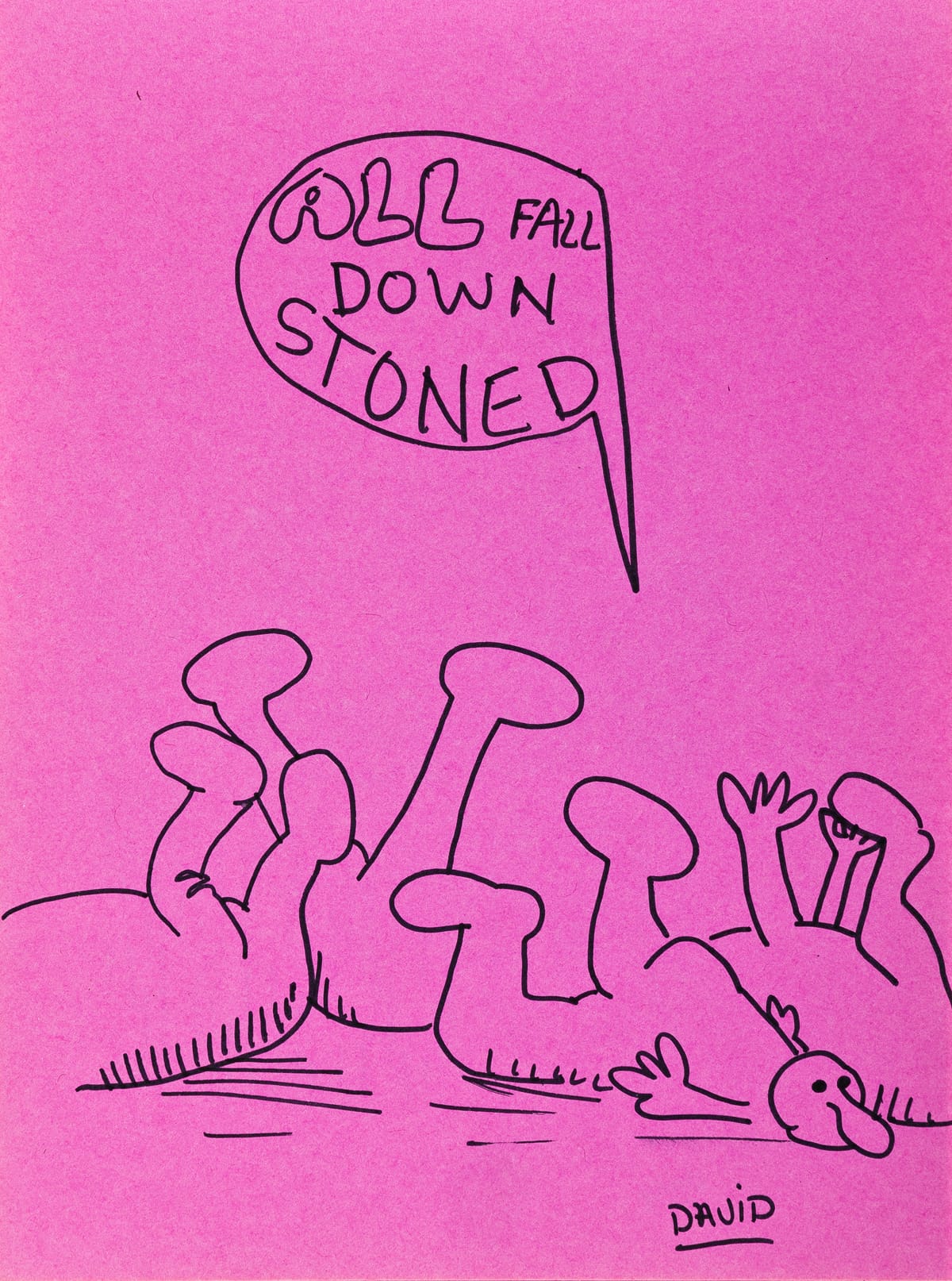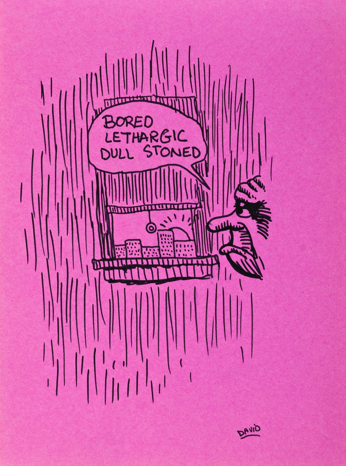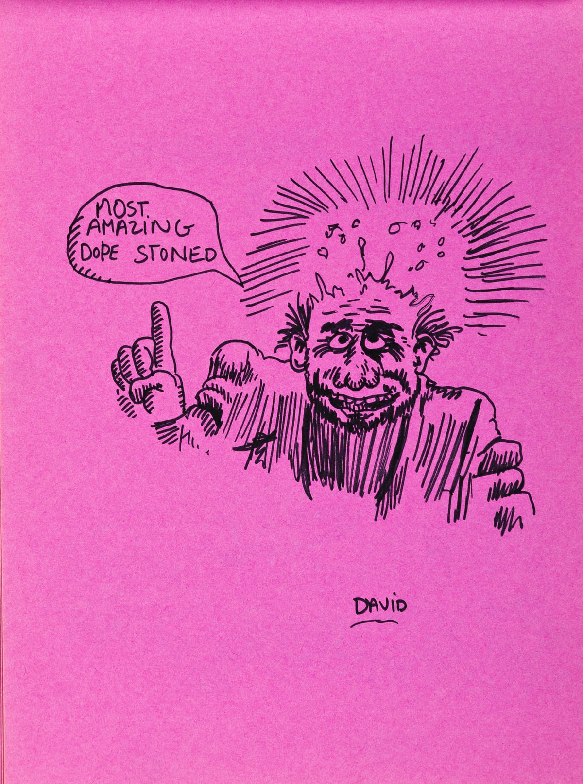 In the early 1970s, a teenage David Wojnarowicz scribbled in a sketchbook: “another way this book describe’s [sic] is the different high’s [sic] that people are on.“ He went on to clarify: “Most not using drugs.” Aptly, its bright fuchsia pages are filled with a cast of characters, rendered in pen and ink, in various altered states ranging from lethargy to acid trip to a lovemaking-sparked dopamine trance.