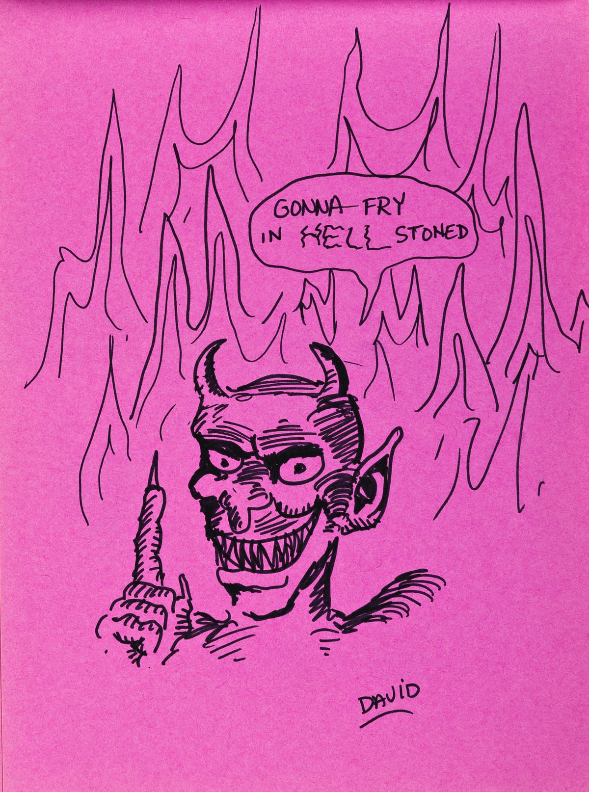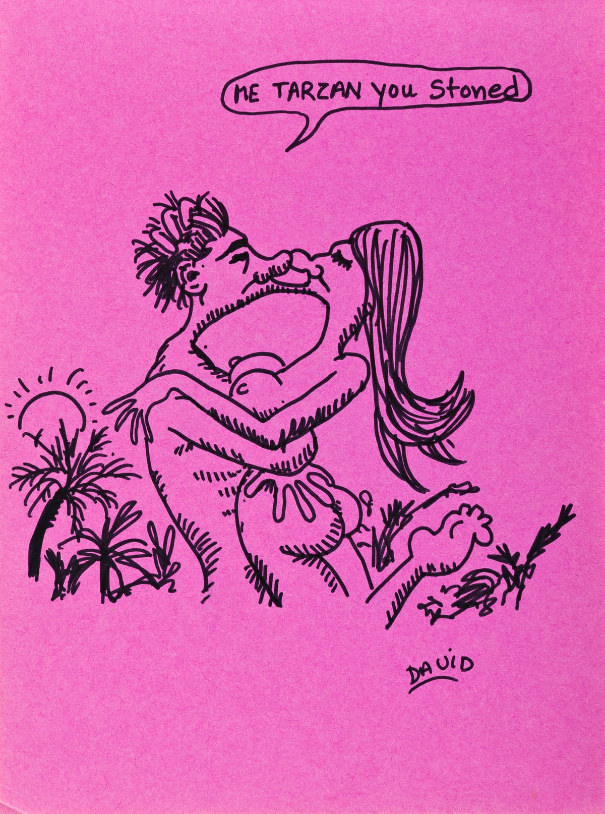 “Stoned Sketchbook” predates “This Kid” by nearly two decades. It was created by Wojnarowicz at his start, not at what’s considered his prime — his 2018 Whitney retrospective, for instance, begins with work from the late 1970s. Yet the cartoonish, loopy creatures and droll captions contained in its bound pages — “me Tarzan, you stoned,” reads a speech bubble floating above a couple caught in a sexy embrace — foreshadow the mature artist’s irresistible irreverence. There is also the “most amazing dope stoned,” illustrated by an Einstein-esque personage whose mind is literally blown, and “gonna fry in hell stoned,” a kooky Lucifer type, lips curled upward in a grimace.(These drawings appear to replicate those of cartoonist R. Crumb and his comic strip Stoned, included in Head Comix, a collection of his comics published by Viking Press in 1968.)