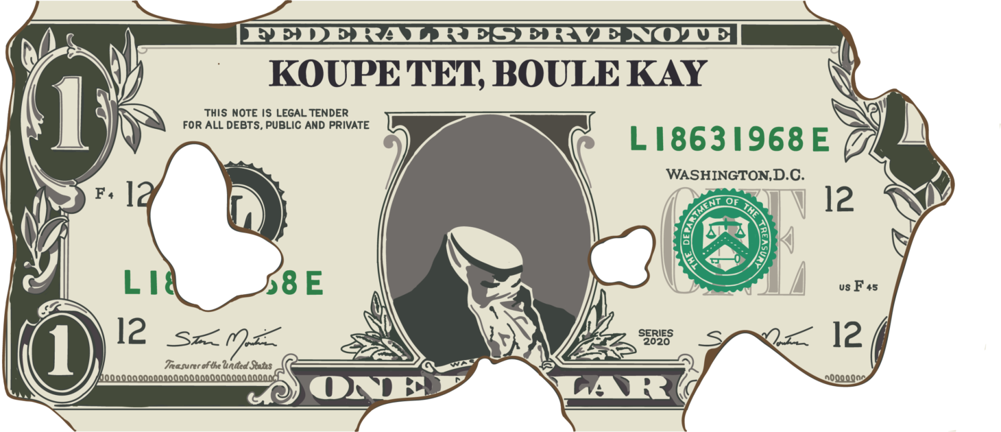Steven Montinar, a digital artist who was selected for the show, says he has complicated feelings about his inclusion. Because his work is used as the exhibition’s promotional image, the museum contacted him earlier than other participants, on July 18. Montinar had initially submitted his drawing “Koupe Tet, Boule Kay” (2020), depicting a partly-burned dollar bill with the Haitian Revolutionary phrase “‘Cut Heads, Burn Houses,” to Printed Matter’s open call for anti-racist posters, organizing material, and other ephemera.