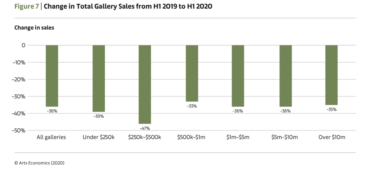 The survey notes that the vast majority of galleries are small businesses with very few staff; those with a turnover of between $250,000 and $500,000, which had only five employees on average at the beginning of the year, implemented the greatest staff cuts, downsizing by 38%. That subset of galleries also experiences the greatest drop in sales.