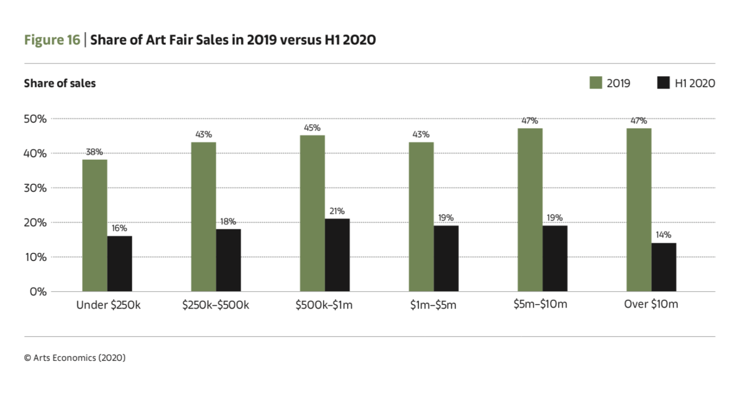 Unsurprisingly, then, the cancelation of most major art fairs this year — beginning with Art Basel Hong Kong in February and, more recently, the fair’s Miami Beach event last week — has had devastating effects on sales. According to the report, gallery sales via art fairs were reduced to just 16% in the first half of the year. Interestingly, the abrupt pause to the jet-set lifestyle imposed by the international art fair circuit allowed galleries to reduce travel costs by over one third, sometimes compensating for other shortfalls.
