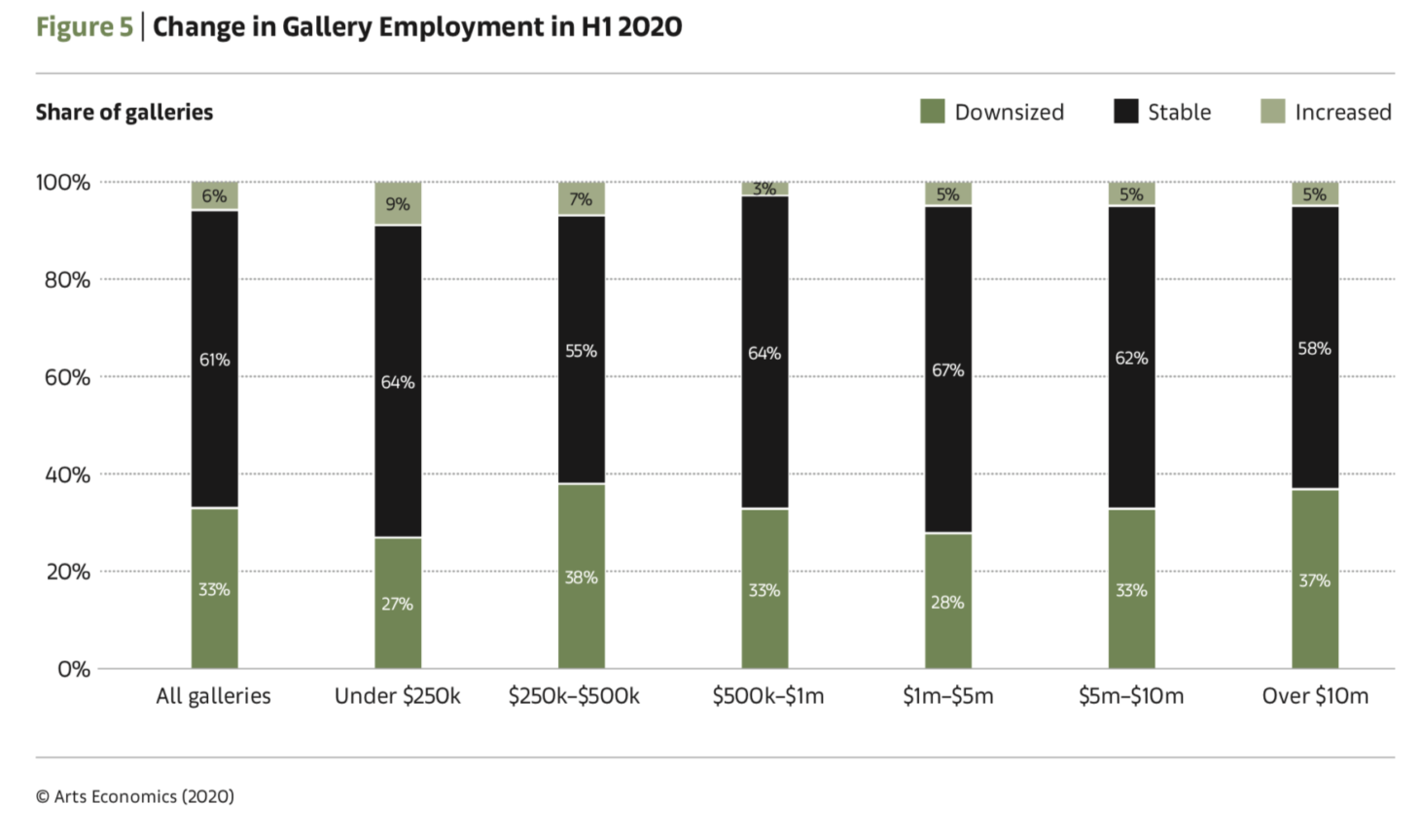 Staff cuts haven’t just hit museums: one-third of dealers surveyed reported downsizing (defined as a combination of layoffs and furloughs). Perhaps most notably, 37% of galleries with turnover in excess of $10 million downsized their staff. (This tier of the business also enjoyed the greatest growth in online sales, which rose almost fivefold by 38%.)