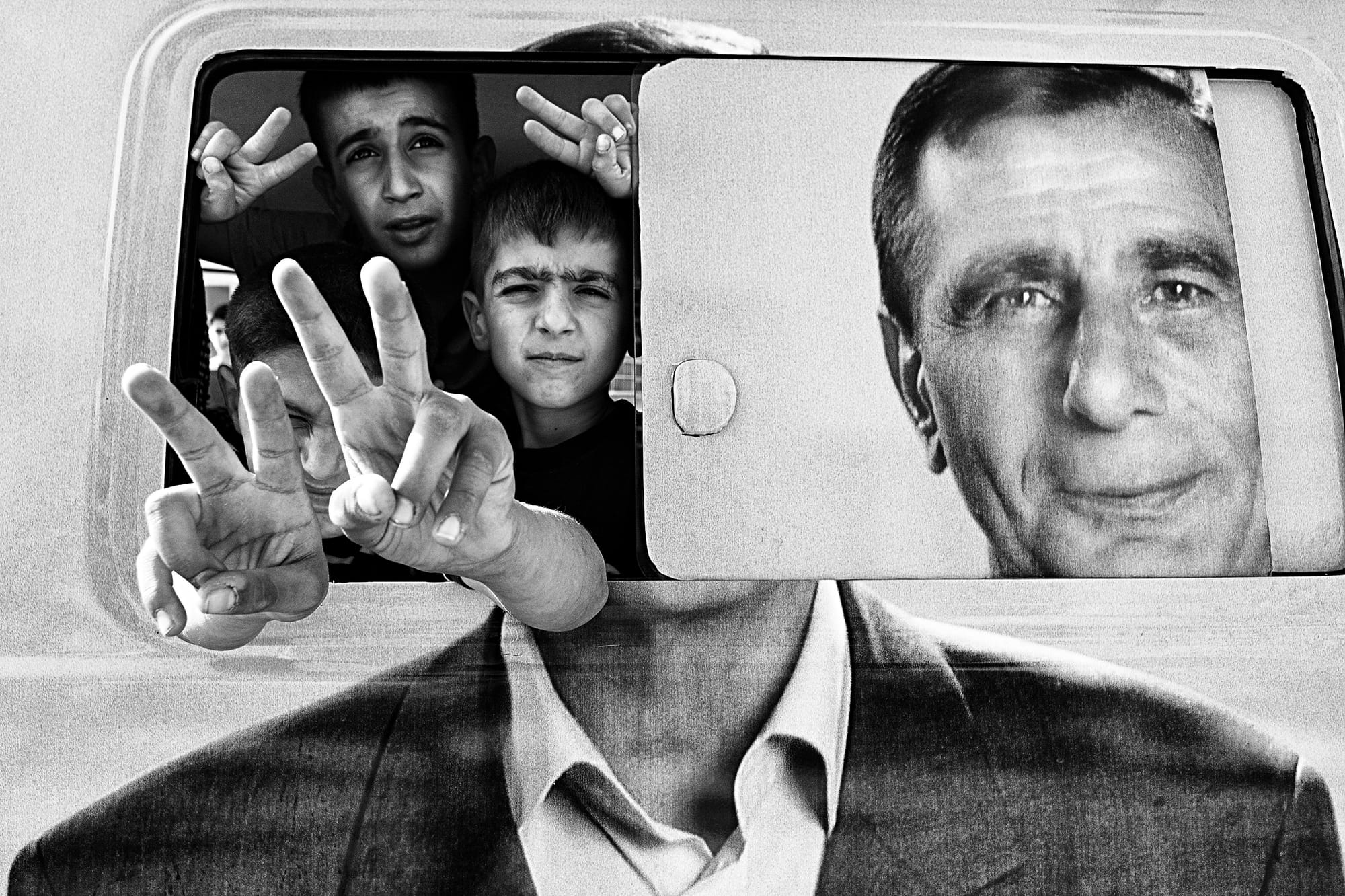 “Election” (2011), a black and white print by Turkish photographer Serkan Çolak, depicts three boys clustered in the window of the election van of Mehmet Tanhan, a Kurdish political candidate who ran for parliament. One of the boys thrusts his hands out of the window as he forms peace signs with his fingers. The image of Tanhan is printed on the car so that when the window is opened, the candidate’s head slides to the right and becomes severed from his neck—perhaps foreshadowing Tanhan’s loss of the election by a slim margin and his eventual imprisonment. It’s an eerie image that merits a second look.