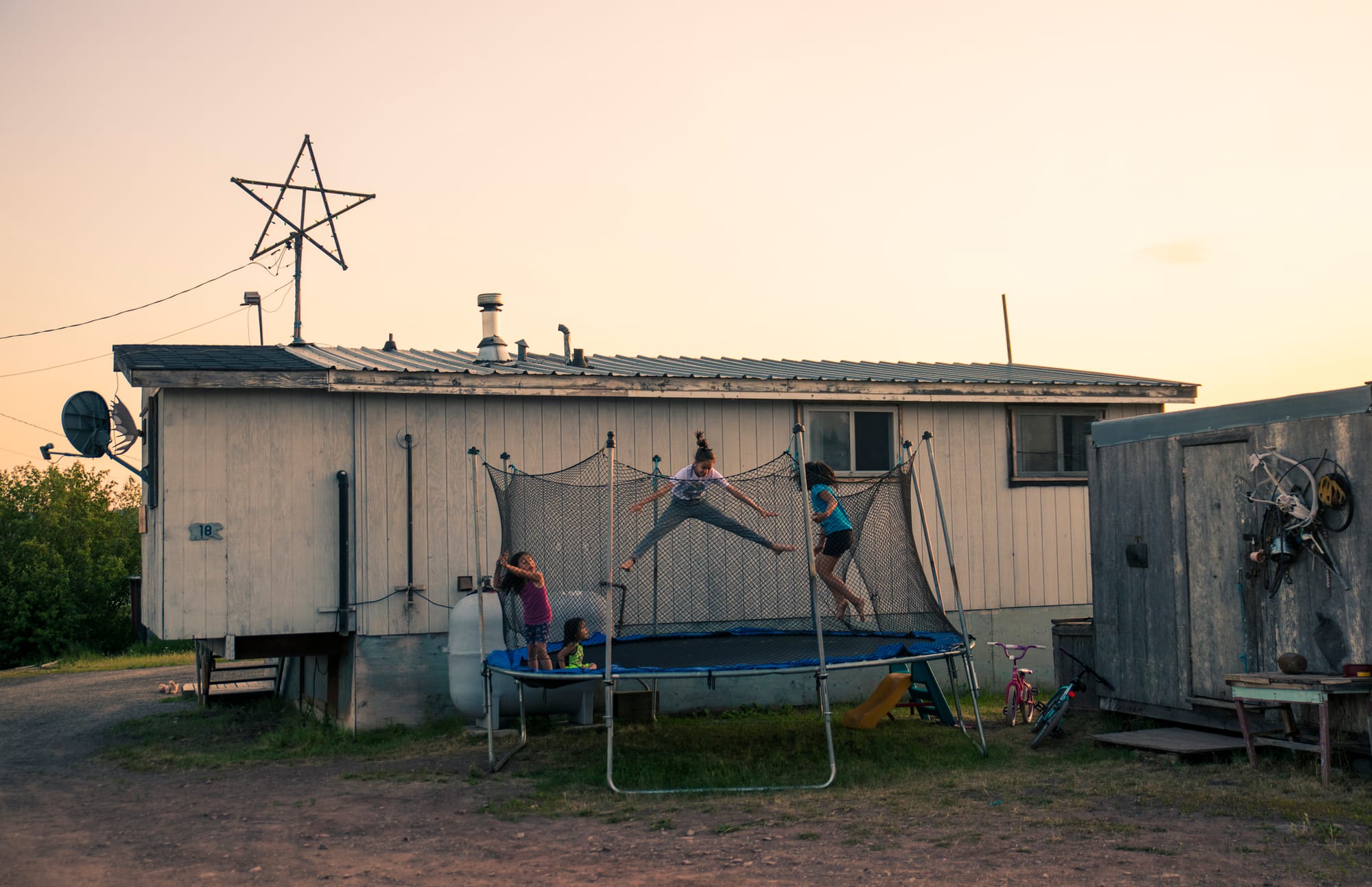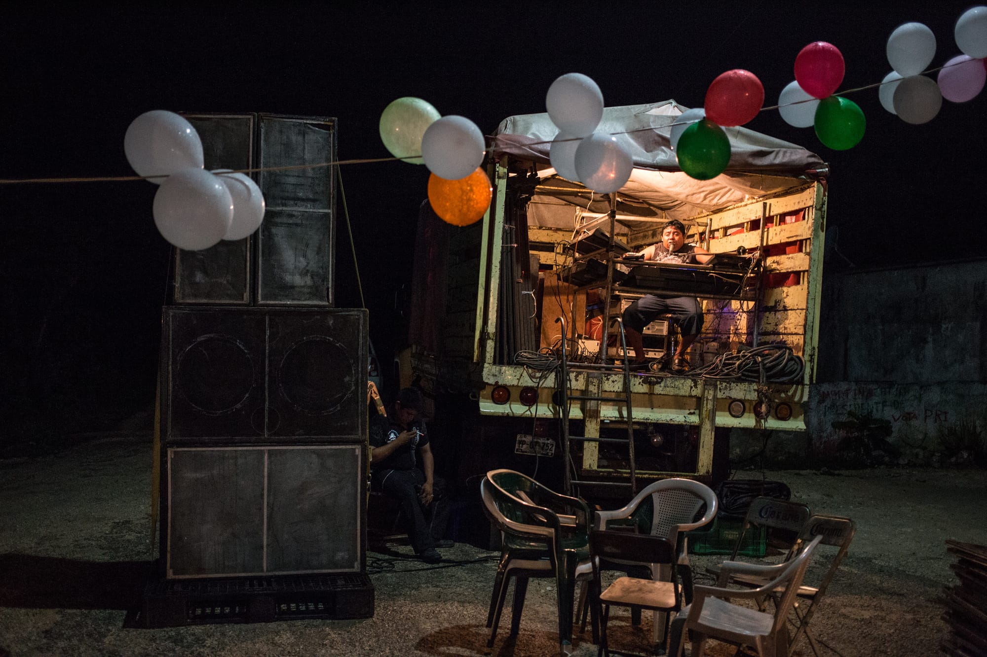 “Rene and His Digital Magic” (2013) is a print that depicts a man playing cumbia in a dimly lit open-backed truck at night. Though the scene is mostly abandoned, large speakers and a string of balloons that cut across the frame suggest a celebratory occasion: a hunter’s baptism. The intimate work is a testament to the close relationship that Palos developed with these communities as he documented their lives.