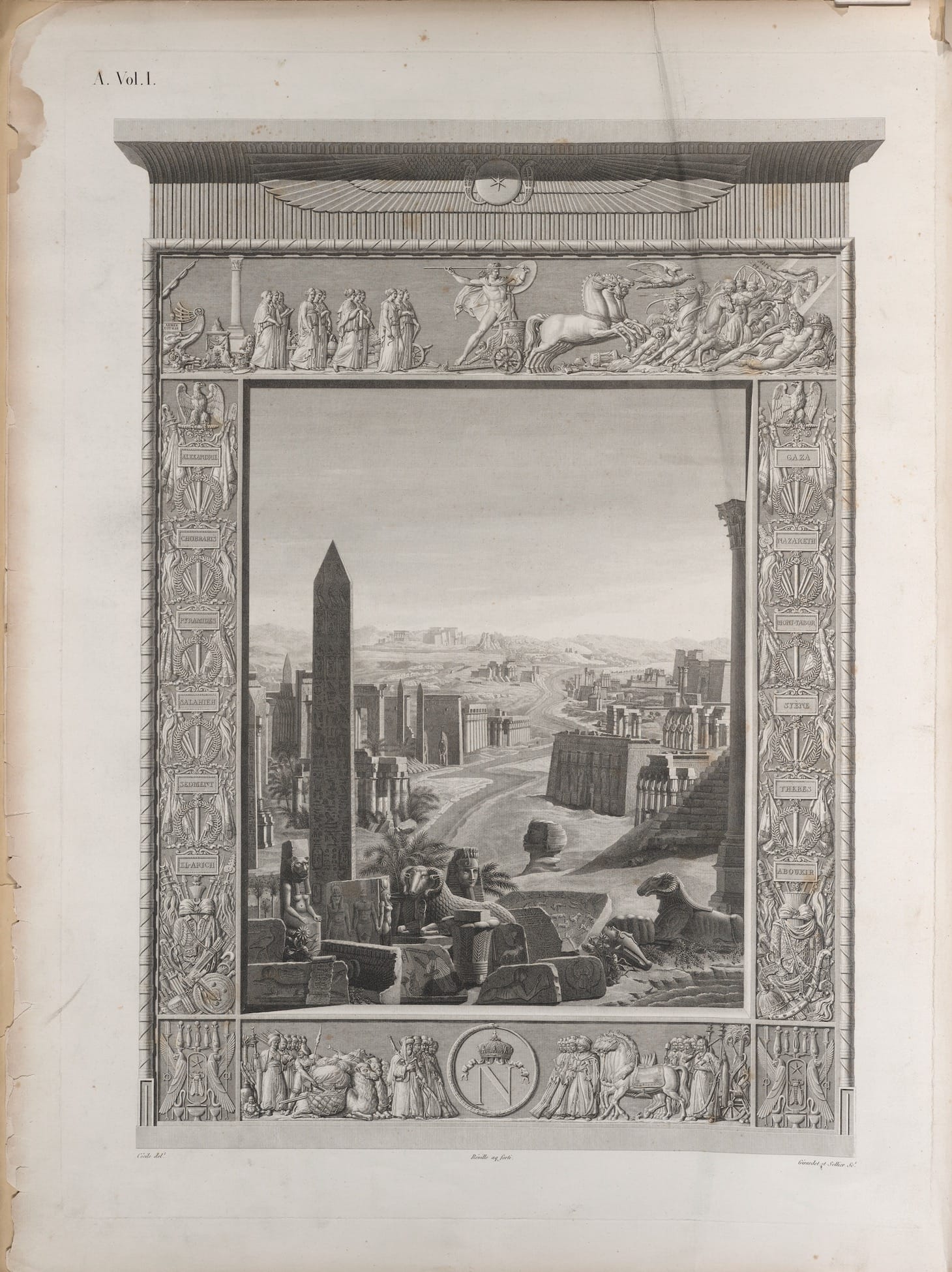 VE’s curatorial anchoring resides in the realm of the Orientalist fantasy, far, far away from anything written since Edward Said, and in disjunction with the historical experience and sensibilities of most inhabitants of modern and contemporary Egypt. The “Egypt” it portrays is reminiscent of the frontispiece of the 19th century French multivolume series Description de l’Égypte published after Napoleon’s conquest. This fictive, deserted landscape was cut through by the Nile river and dotted with impressive pharaonic monuments covered in hieroglyphics, ready to be “explored” by white “experts,” whose lavish and civilized lifestyle matches the long-gone sophistication of ancient Egypt’s mystical grandeur. In this regard, the Classical-style frieze (which shows an Apollo-looking, Muses-leading Napoléon driving the Mamluks out) surrounding the Description’s frontispiece’s rendition of Egypt serves as a powerful statement of the power relationship at stake: Egypt is defined by and for the male, European conqueror’s ability to penetrate, occupy, and, to paraphrase a now famous political slogan, “make her great again”.
