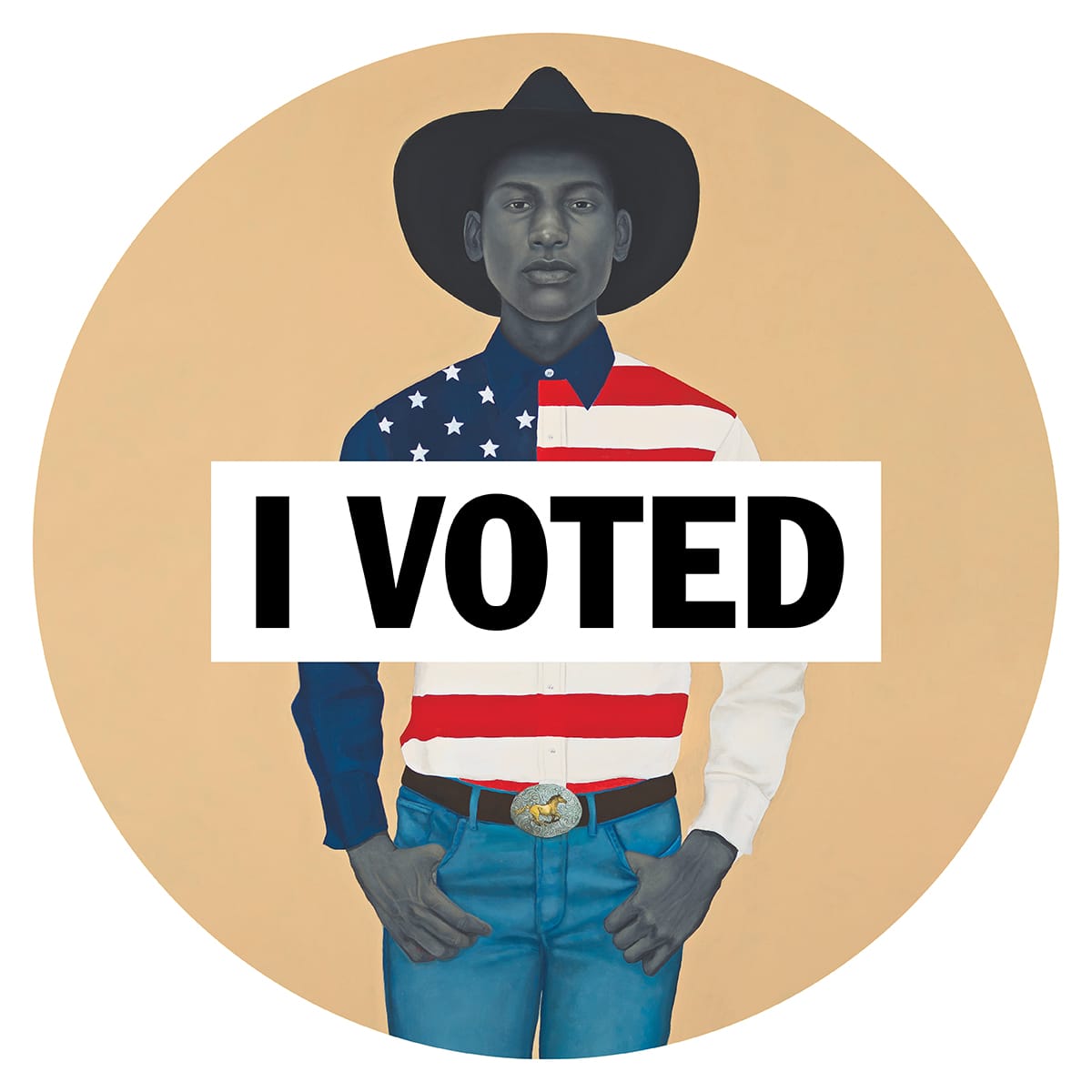 “Growing up in the South, I viewed the American flag as belonging to a people whose patriotism was solely reserved for whites,” Sherald writes in a text accompanying her sticker painting, which features a Black cowboy wearing a shirt with an American flag design. “My American flag represents a ‘whole’ country. A flag that conjures hope, empathy, resilience, unity, freedom, and justice.”