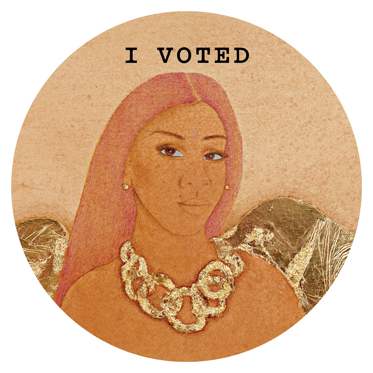 Sun Kim created a sticker that visually represents how to sign “I voted” in American Sign Language (ASL) while Derrick Adams’s contribution highlights civil rights activist Bayard Rustin, an organizer for Martin Luther King Jr.’s Montgomery Bus Boycotts and the March on Washington.