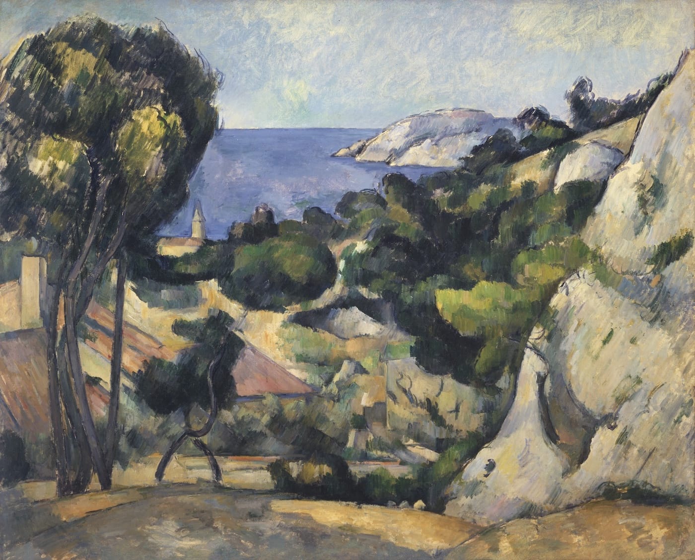 The first was nature’s inherent order as manifest by the layers, geometric patterns, and other striking shapes that the earth assumes. Already in the paintings from the first half of the 1880s, which treated the coast between the seaside village of L’Estaque and Marseille, the vistas and their depiction project a strange, rhyming synergy. Put another way, the serried, repeated rhythms made by the Kimmeridgian limestone fuse with Cézanne’s facture. Mimesis of a special kind is at stake, leading paradoxically toward the abstract. “Rocks at L’Estaque” (1883) and “At the Bottom of the Ravine” (c.1882) exemplify this perceptual equation. One might say that the “cubes” of Cubism lay dormant in the mineral slabs of the Midi’s maritime scenery.