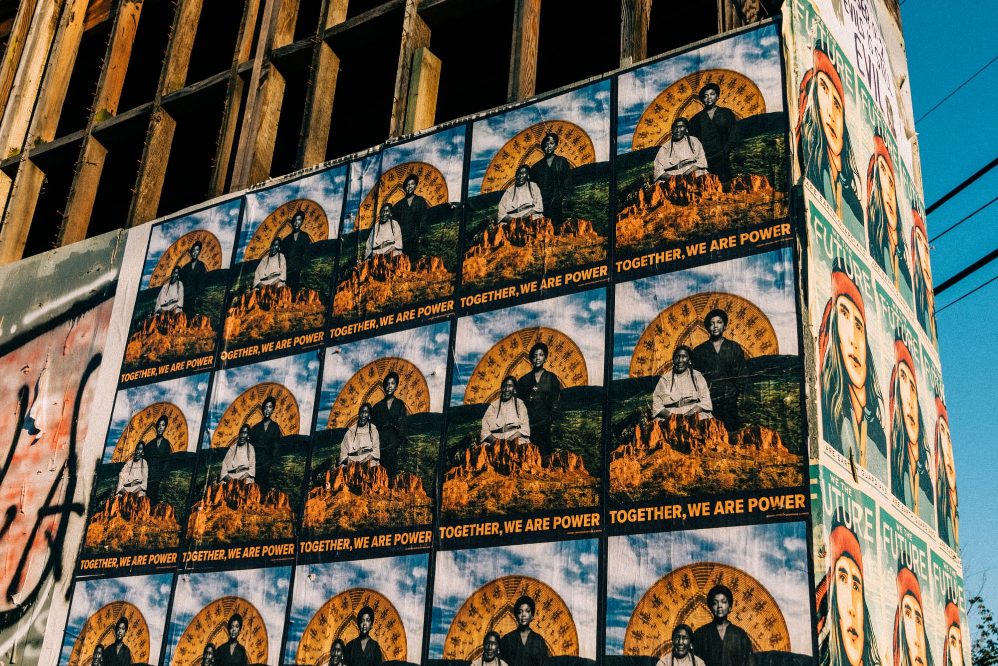 Four works uplifting Indigenous narratives were distributed around the country as posters and stickers, and as large-scale murals and projections in cities across the US.