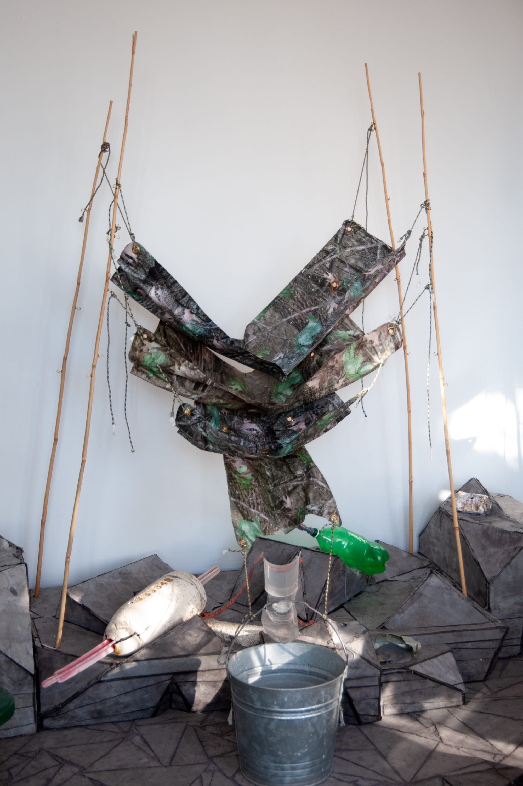 Zac Skinner, "Rainwater Collector (Woods Pattern) with Rocky Stand (2019-2020), stitched camouflage-printed tarp, thread, brass grommets, bamboo, rope, bucket, copper, approx. 60 x 72 x 54 inches; Rocky Stand: Natural pigments, natural plaster, wheat paste, cardboard, human-made detritus from the Hudson River (courtesy of the artist)