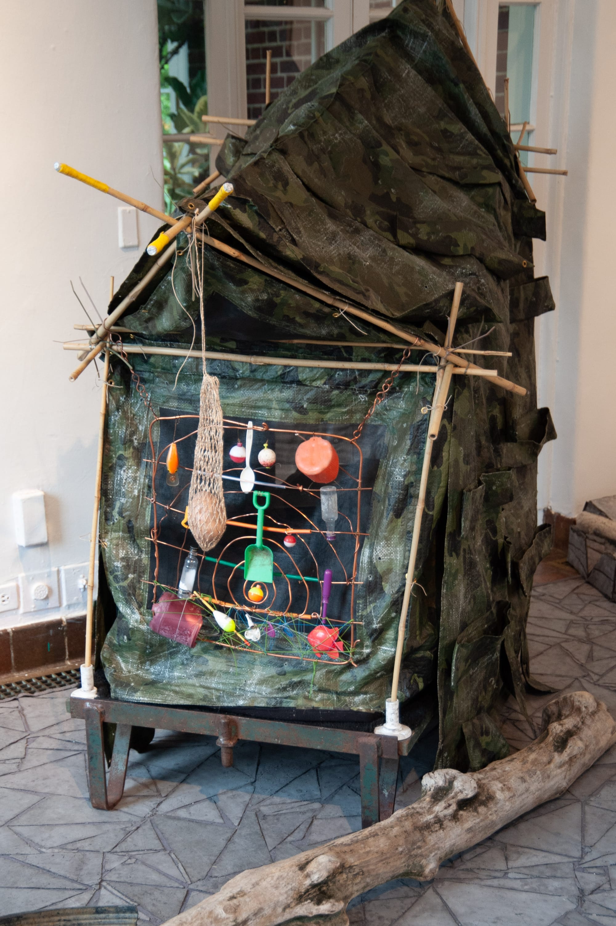 Zac Skinner, "Wisdom Tent" (2018-2020), handcart, bamboo, tarp, fabric, string, zip ties, grommets, copper, detritus, approx. 72 x 96 x 96 inches (courtesy of the artist)