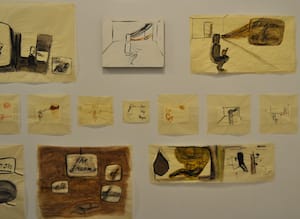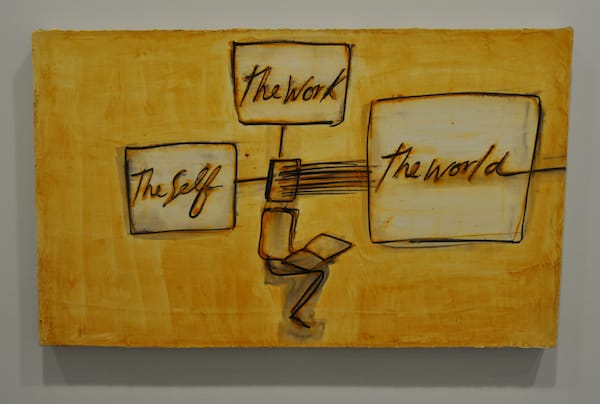 All the works are rather small — the drawings are often larger than the paintings — and they appear to meditate on the state of the artist and intellectual, both labels that fittingly describe Schor.