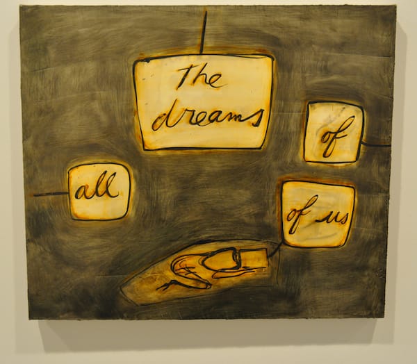 What fascinated me about the show was her drive to collide language with imagery to create something new. Her cursive text tells a story but so do her characters. It’s a word of solitary contemplation, with words, with pictures, all coming together and making something new.