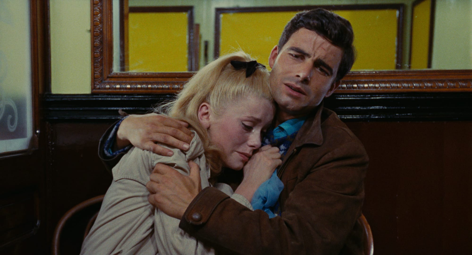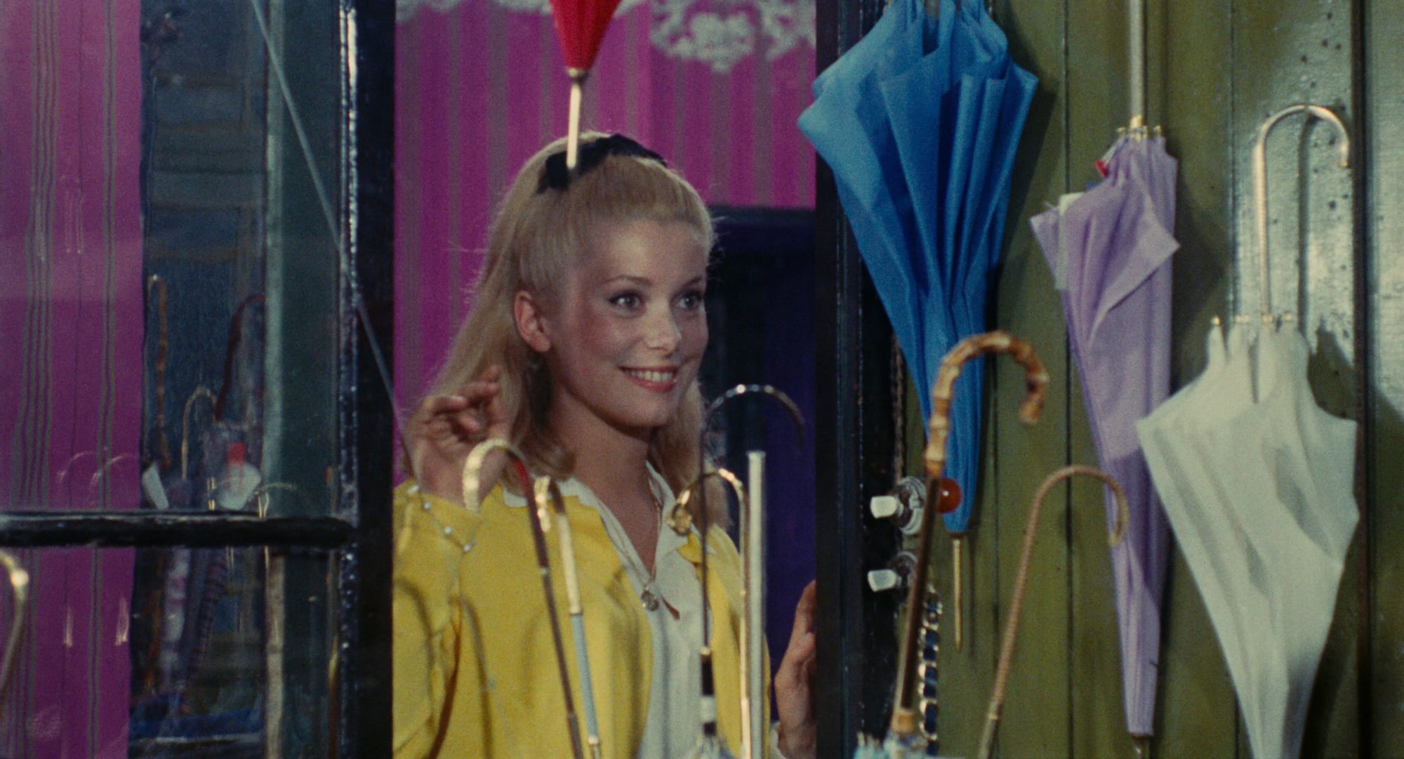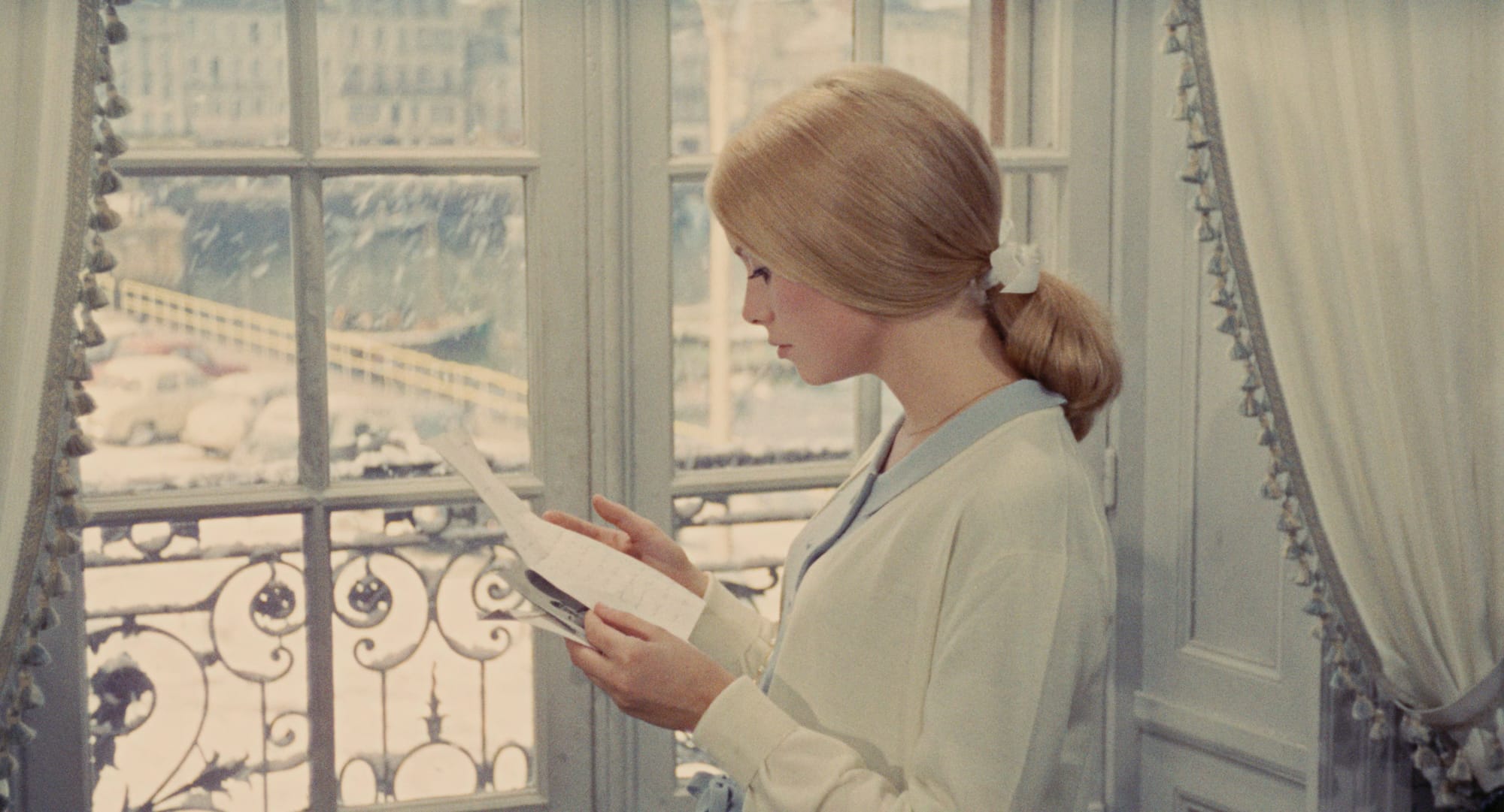 The first shot — of Cherbourg’s humble port — is over two minutes long, the camera craning down at worn cobblestone as rain falls upon it. The umbrellas of sundry passersby, along with the title credits, gesture to the tricolor flag, one of many reminders that this is a French film. Until Jean-Pierre Jeunet’s Amélie in 2001, it may be the most conspicuously French film to become a global hit. And like Amelie, the delectable mise-en-scène often distracts from the plot. Unlike Jeunet’s film, though, the setting isn’t Paris, but a shipping town mostly known for a key battle during World War II.