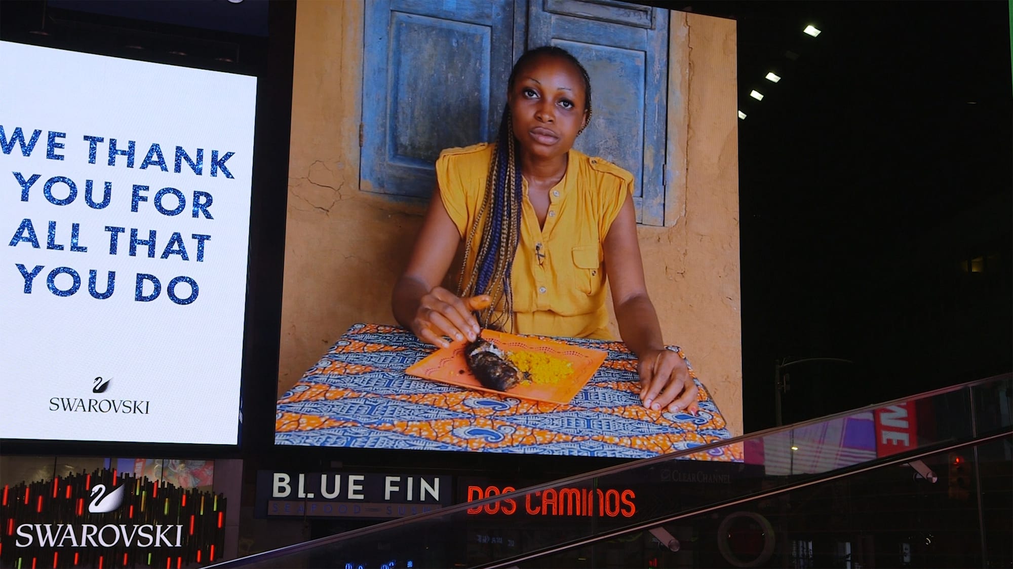 INSTALLATION NEEDS — Presented in partnership between Times Square Arts’ Midnight Moment programme and Medium Tings, Table Manners demonstrates how impactful larger-than-life billboard presentations can be in reaching a cross section of audiences. Screened across synchronized Times Square electronic billboards, the 15-minute-long video works candidly show documentary style individual sitters consuming a meal, highlighting food consumption as a definitive act within West African communities and traditions.
