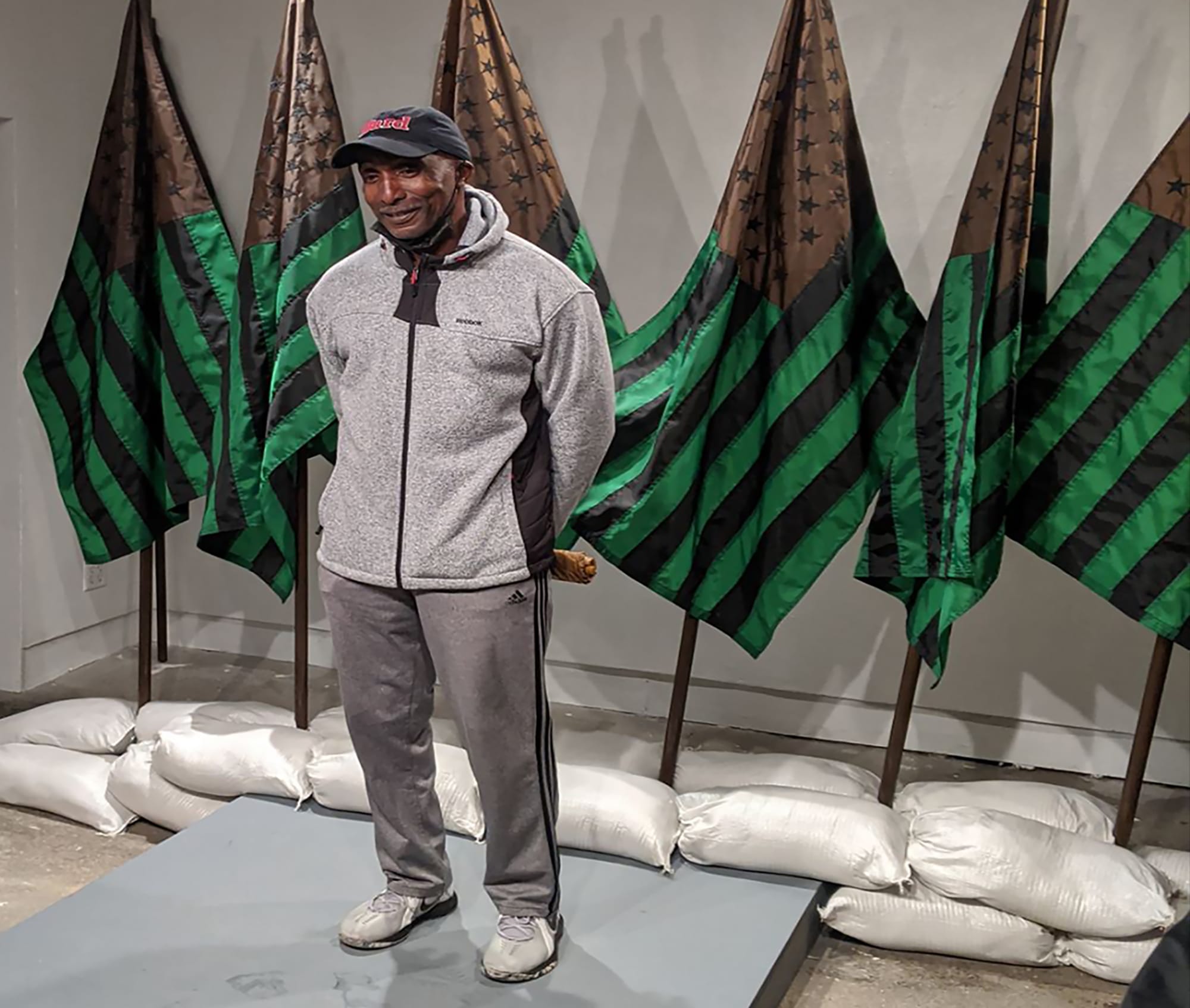 With livestreaming emerging as the de facto replacement for in-person events, performance-based artists and curators are adapting with broadcast-informed projects. Stephanie Dinkins, a transmedia artist whose work often delves into the ways communities of color aren’t fully represented in AI data, continues to explore how oral histories can infuse technology with her latest work. COMPLEMENTARY, a participatory installation currently mounted in Brooklyn’s Open Source Gallery, counters the exhaustive American presidential 24-hour news cycle by inviting visitors to respond to a prompt — "If you were to speak directly to the most powerful person in the world, what would you want them to know about you and your community?" — and broadcast themselves from a podium surrounded by complementary flags.