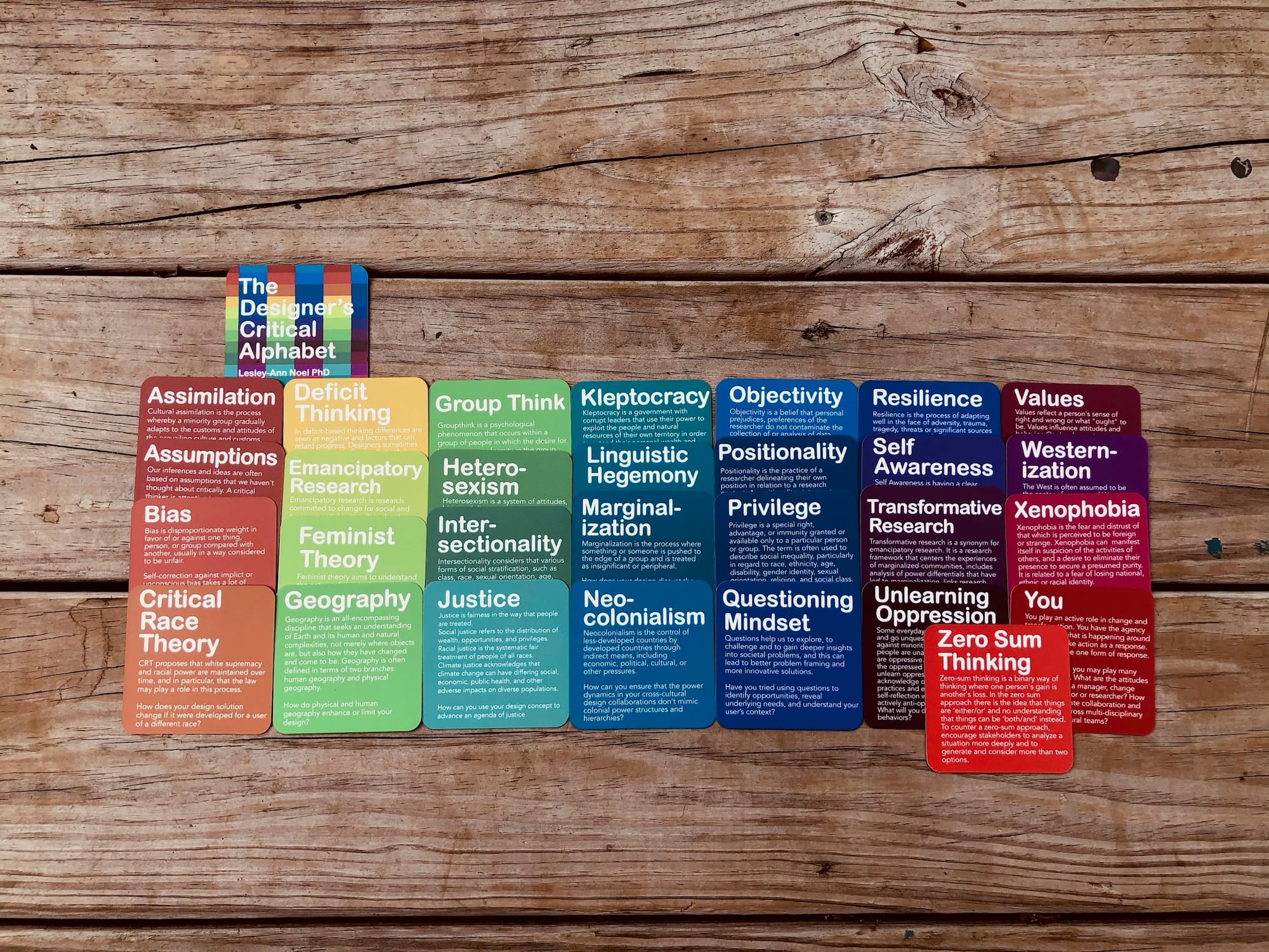 The Designer's Critical Alphabet I created in 2019 as a response to the issues in that class was one of a series of pedagogical experiments to help students see how positionality and identity can impact people’s needs and how products and systems are used. I created the deck as a response to my perception of a need for greater critical awareness among people in Silicon Valley, where the classes were taking place. and where design solutions might go out to the entire world. I was trying to make critical race theory language accessible to designers, and remind designers to think about multiple perspectives as they worked. My position as a Black woman and an outsider influenced the way I designed the tool.