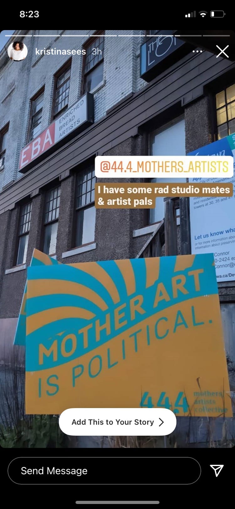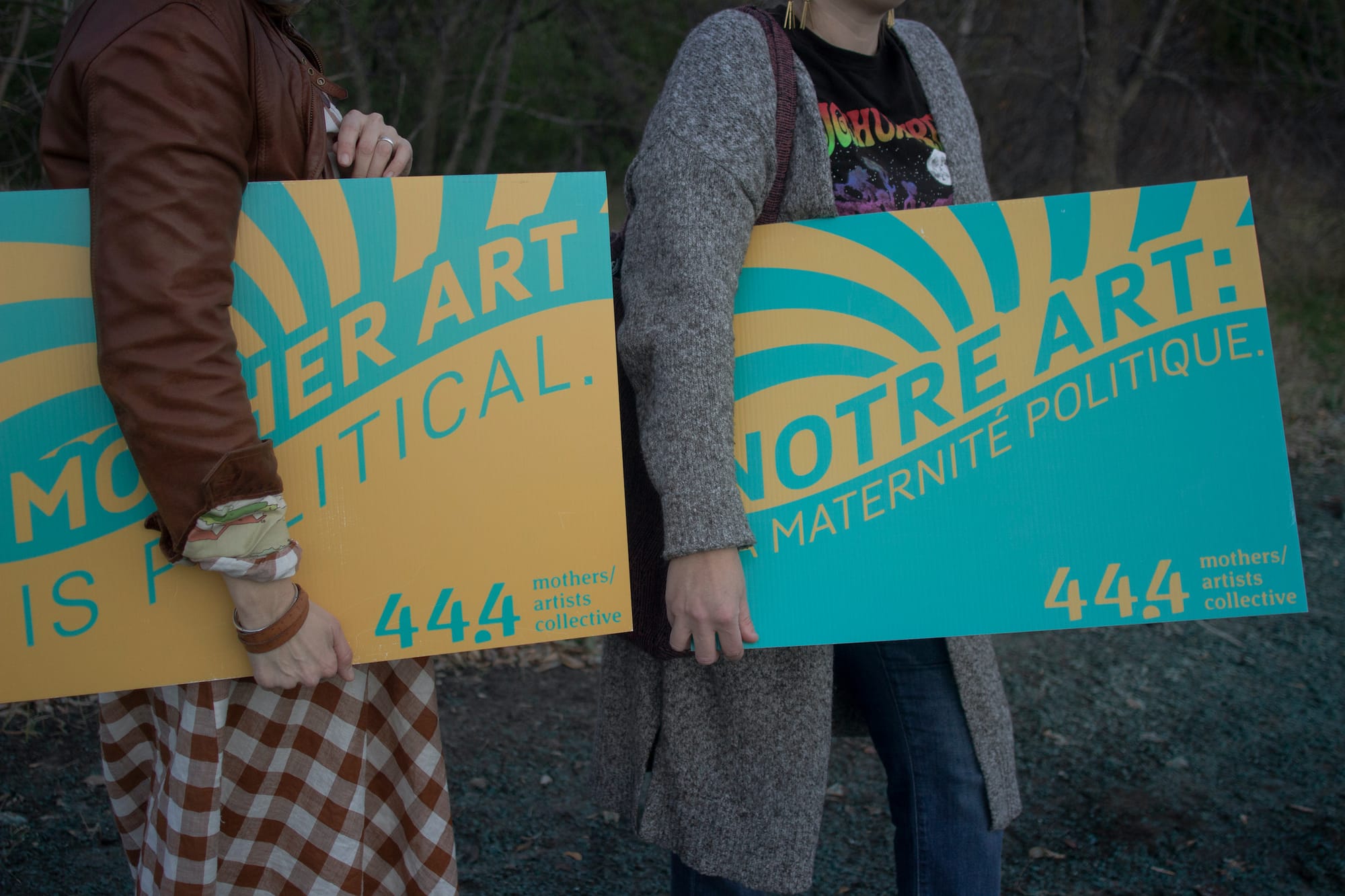 “While our sign interventions are local, the project has taken a real look outwards and has us considering how we can connect to other mother artists networks that already exist as well as connect to mother artists that aren’t already connected to a larger network,” says 44.4 artist-member Jennifer Cherniack.