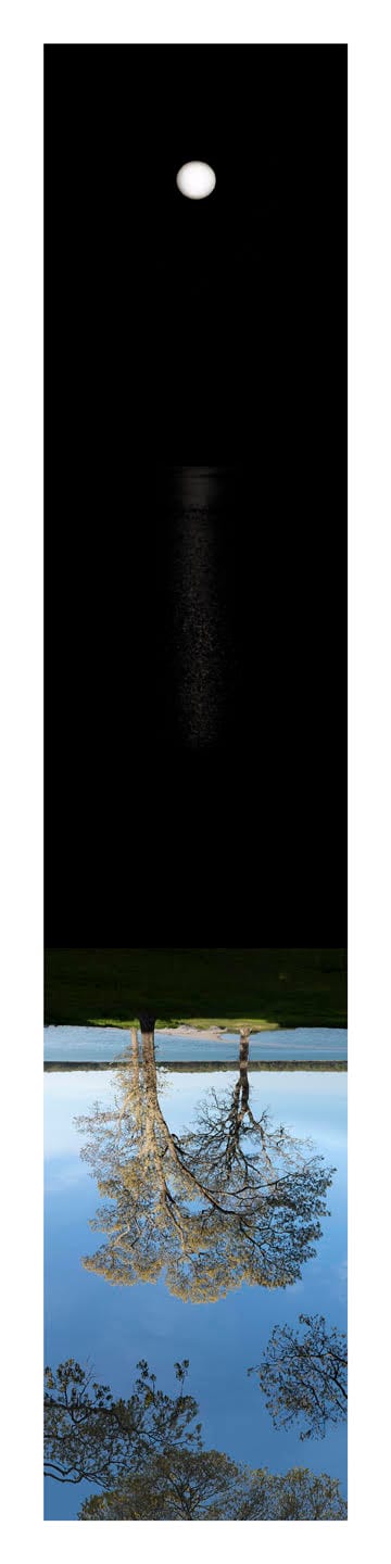 In “Desire Lines” (2020), for example, the borders of several landscape photographs blend together to form belts of textured color. The sections of crystalline sky, grassy sand, and snowy mountains conjure a placid sense of deep time. Yet inverted sand dunes create an illusionistic sense of slight disturbance, as if the image’s sandy section was floating in the sky above the mountains. “The Gualcarque River” (2020) turns on a similar dynamic. A full moon hovers above a serene, pitch black river, while the column’s bottom third depicts a daytime, upside down shoreline whose flipped trees look like plant roots surreally growing out of the moonlit darkness.