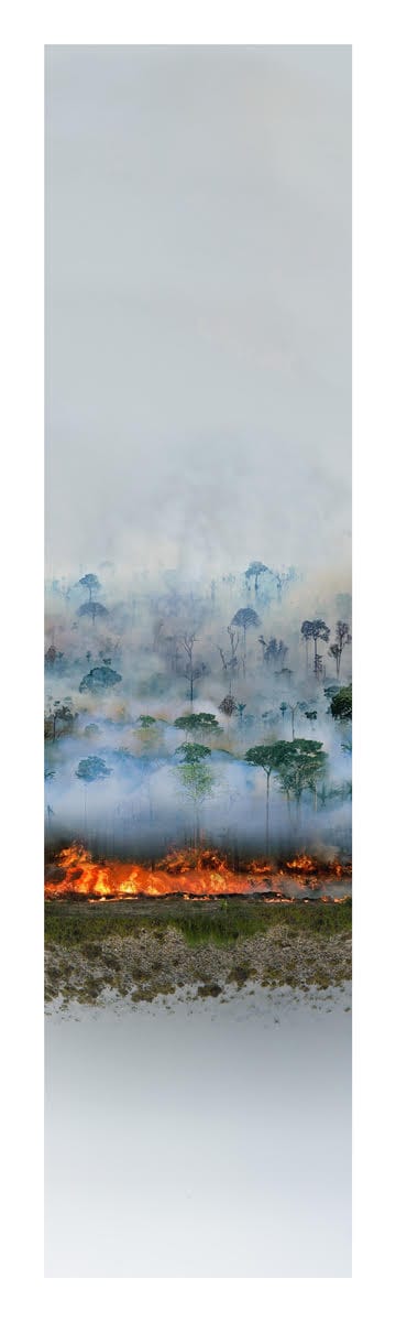 For all their jigsaw intricacies, the composite images possess an air of tranquility; their puzzle pieces may not fit together seamlessly, but the incongruities feel deliberately minor in the scheme of things. “Controlled Burn” (2020), for instance, depicts a planned forest fire whose magmatic hues stand out from the image’s muted color palette. Yet the fire comprises a mere sliver of the larger image and is safely confined to the smoky forest’s edge, while the gauzy stretches of sky above and snow below evoke a sense of vast calm. Mattingly’s landscapes take the literal and figurative long view of their own environmental modifications.