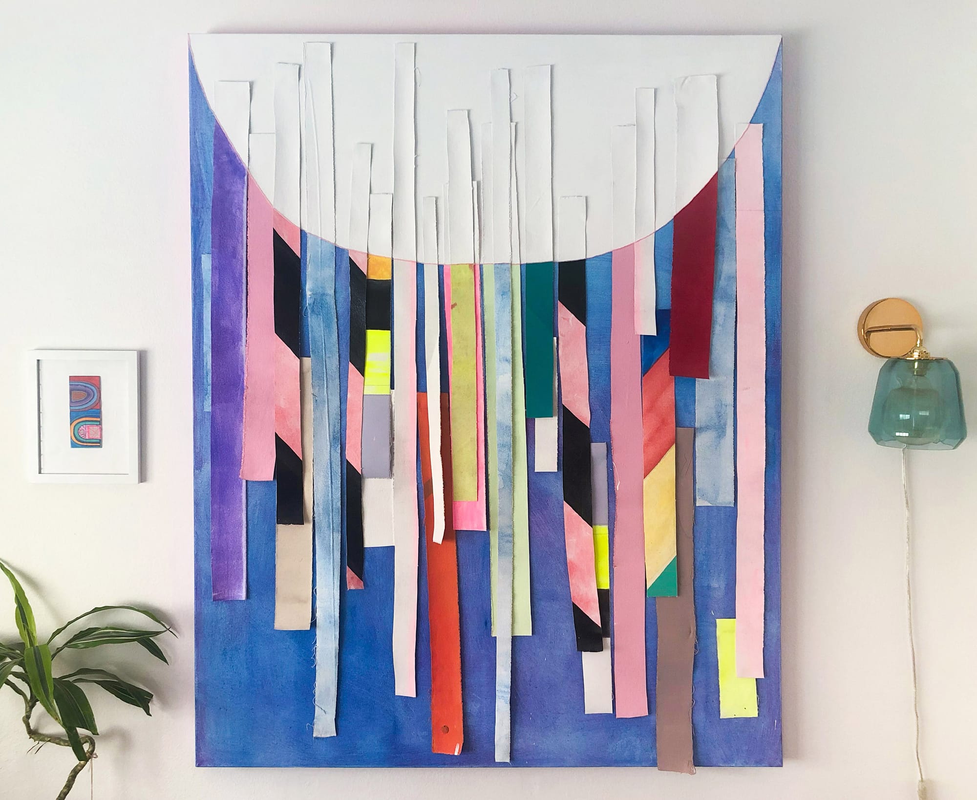 The painting has been present through this period. It expanded and opened its arms wide. It became a window and an anchor that my son has lived with for most of his life. It is large, but its physical scale pales in comparison to the energy it exudes. It is like a prism that keeps transforming. The washy pinks, greens, violets, the one opaque red, the blues that reflect the sky on a clear LA afternoon; the black shapes, parallelograms, and fluorescent yellow rectangles that recall signs, the city — they are all contrasted by open space. They transport you. The white recedes into the wall. It oscillates beside the strips of canvas that flicker against an early evening blue backdrop of warms and cools. It feels like a walk, like fresh air.
