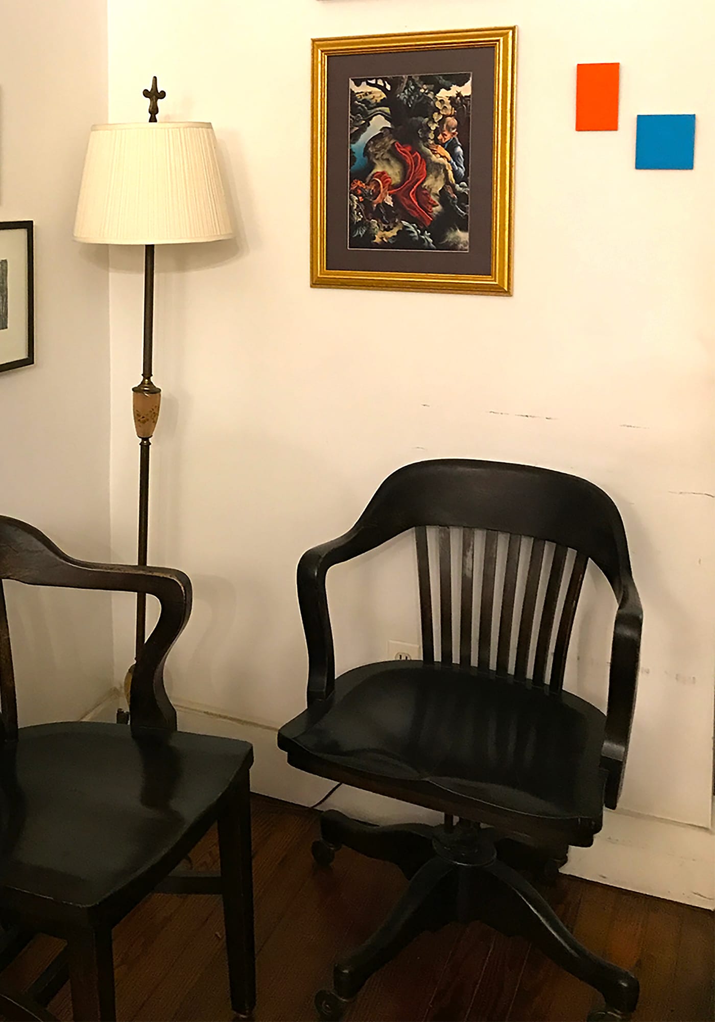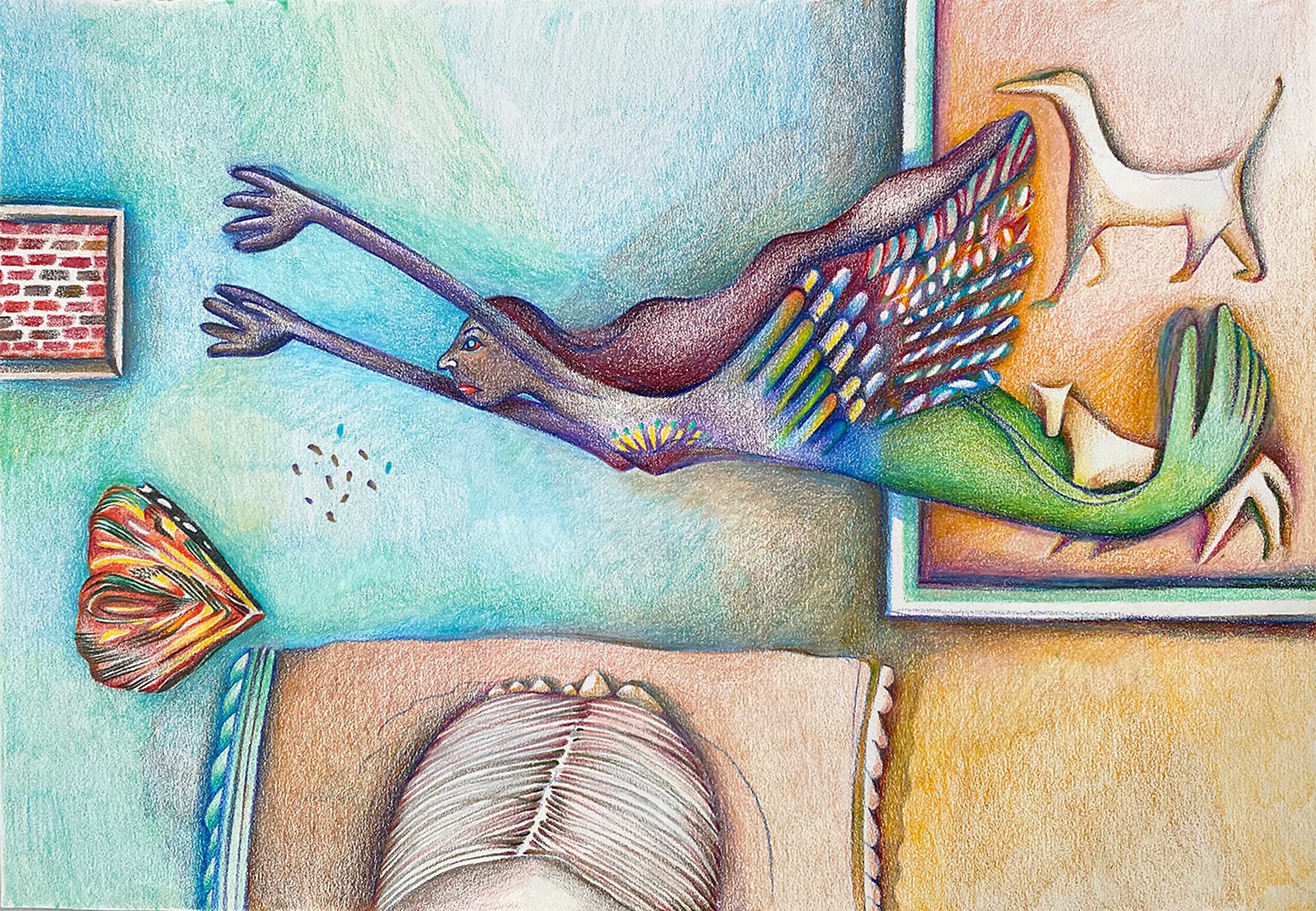 Barry Hazard (Brooklyn, New York): I own this colored pencil drawing by Jaqueline Cedar. It is a bold, playful rendering of a flying woman, floating over the top of a well-combed head and surrounded by other randomly suspended images. Initially, the drawing seemed ethereal, full of levity, whim, and casual humor. As the days of quarantine progress, I am beginning to look at this drawing in a slightly different light. It now looks a little heavier, tenuous, surreal, with a touch of angst. It is the same daydream narrative as the first time I saw it, but now I wonder what I may have initially missed, or if the 2020 experience has tainted my perception.