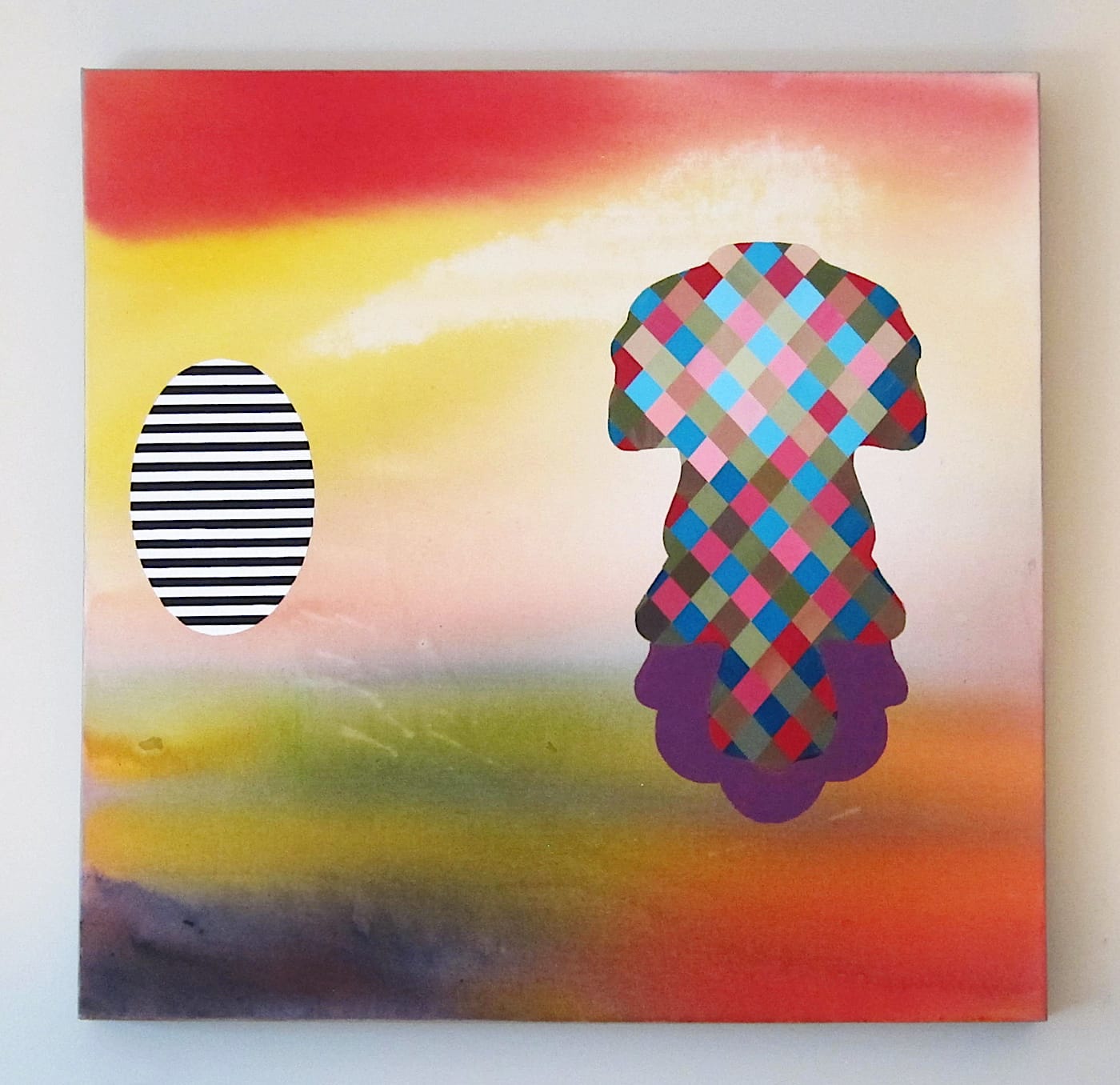 The painting has two parallel objects — a silhouette of a Buddhist torso, flattened with a diamond pattern, and a striped oval. Both float serenely forward from slightly diagonal washes of an unfolding spectrum of pure colors. Deep space, deep consciousness, geometry, and a light touch. How he keeps it breathing still has me hypnotized, and I intend to stay camped in its spell.