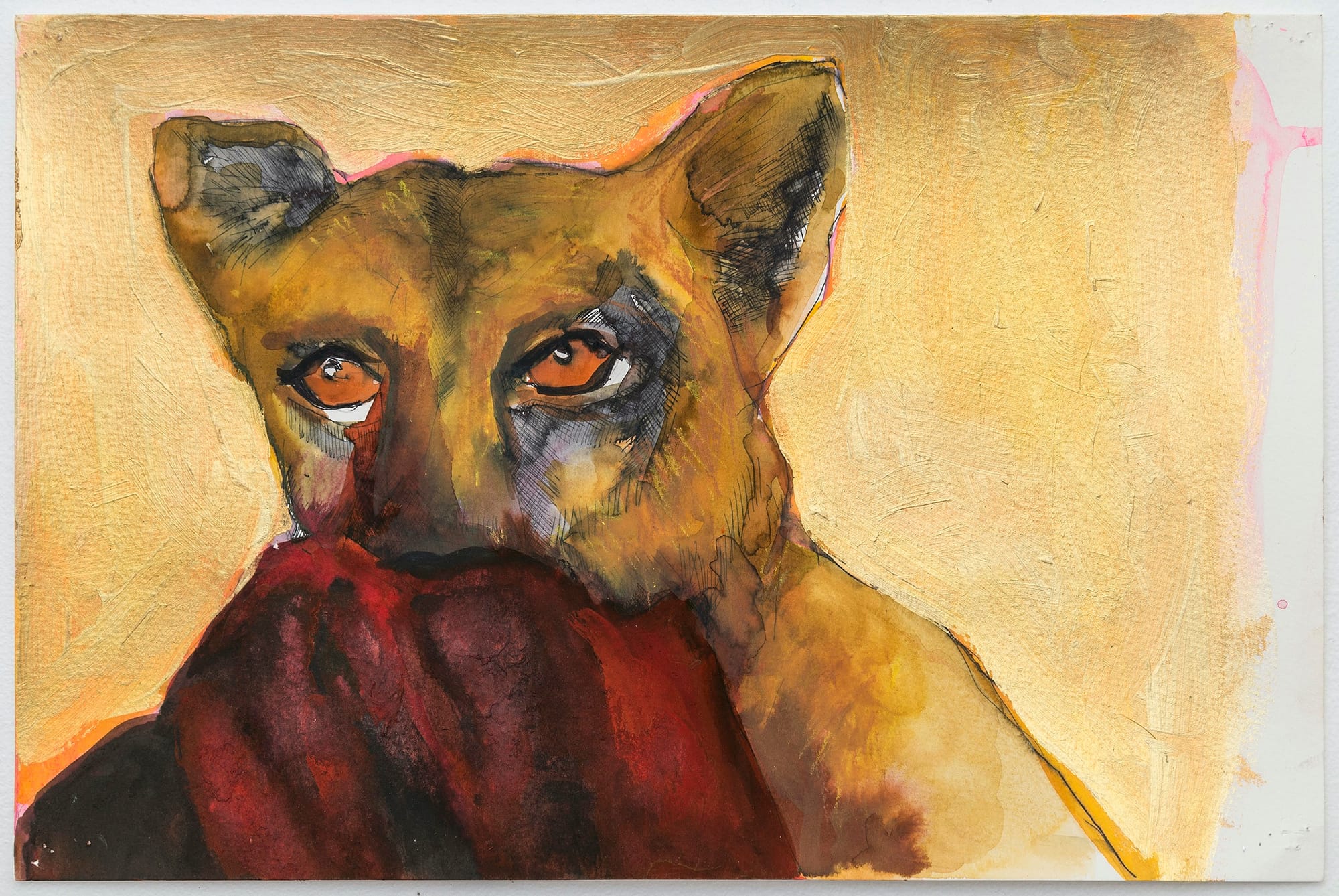 Back in January 2020, my perception of this painting by Karen Heagle would have settled on the otherworldly majesty of this lioness surrounded by reflective gold while adorned with the deep velvet red of a mouthful of meat pulled from a carcass — wild, powerful, and beautiful.