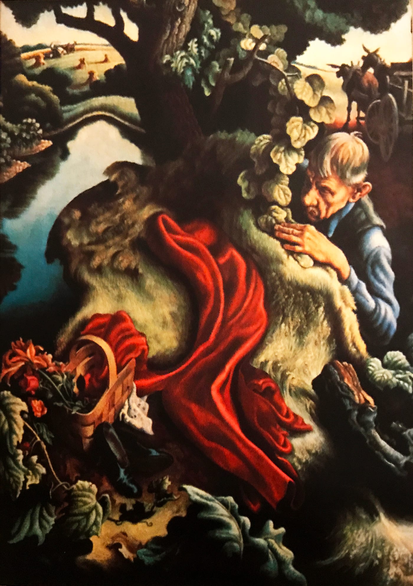 Thomas Hart Benton’s 1939 painting, “Persephone”(which Grove alters) is based on the Greek myth of Persephone, the daughter of Zeus, who is abducted by Hades, the god of the underworld. Through the abduction she becomes goddess of the underworld, springtime, flowers, and vegetation. She is often portrayed robed and is said to make her appearance in the spring in anticipation of the harvest, and later in the fall disappears back into the earth.