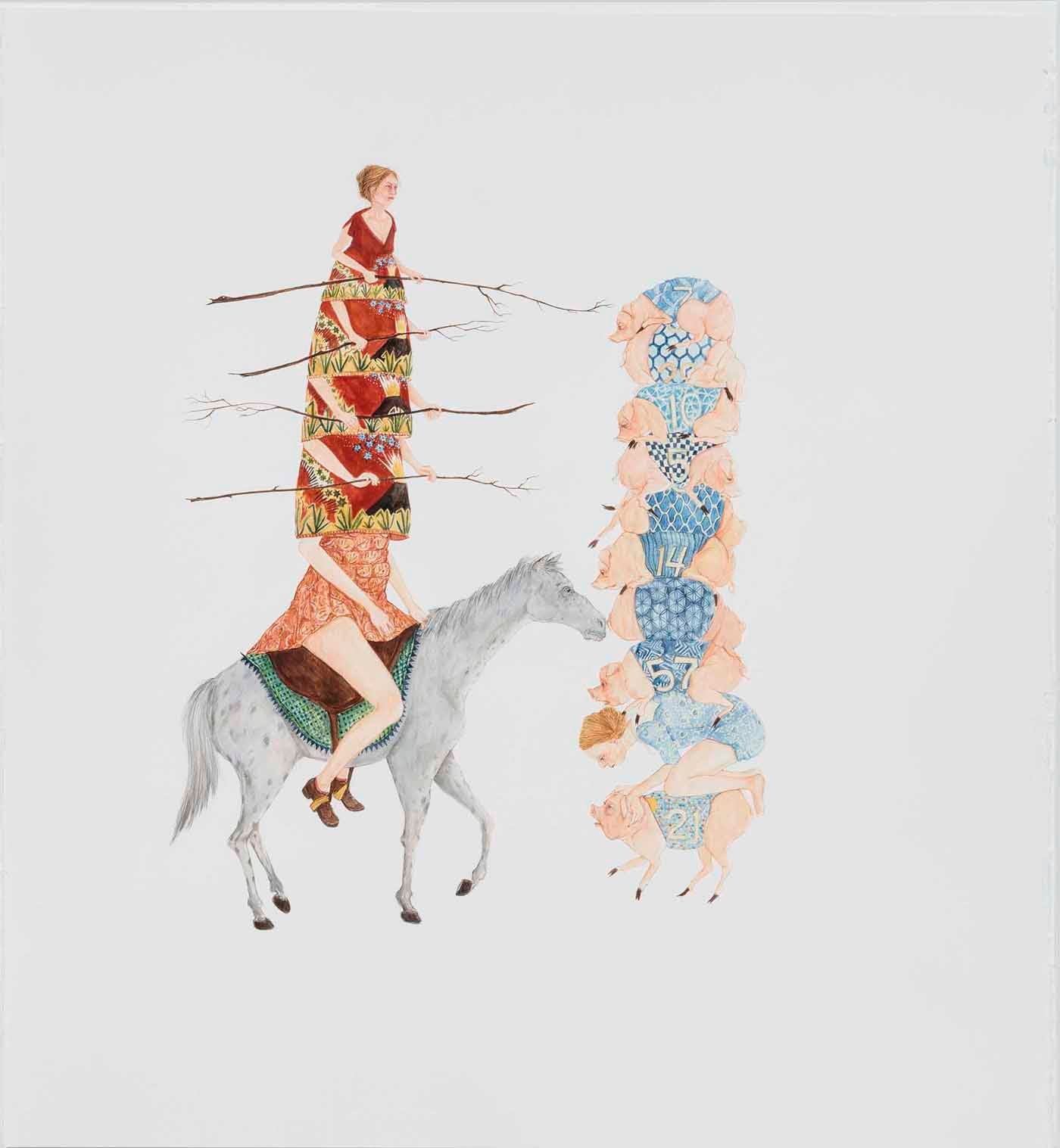 Amy Cutler's narratives are perhaps less ominous, but present imagery evocative of folklore; stories which impart communal values and caution against uncertain terrors. Mostly female figures are stacked in totems or bound together by long braids, as they navigate tree houses or wrangle fantastical creatures. The brighter palettes and more intimate focus bring a kind of lightness, compared with O'Neil's Boschian landscapes, but they still hold the kind of uneasiness that attends the darkness beyond the campfire.