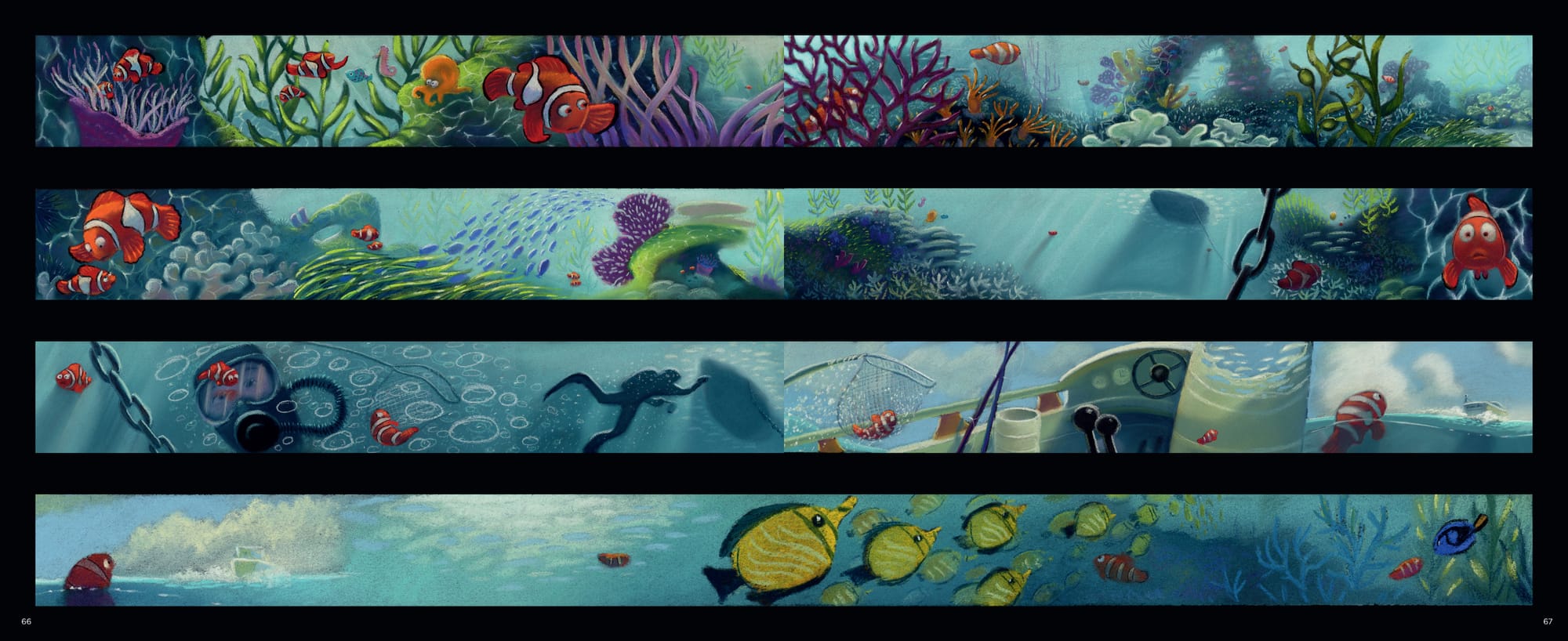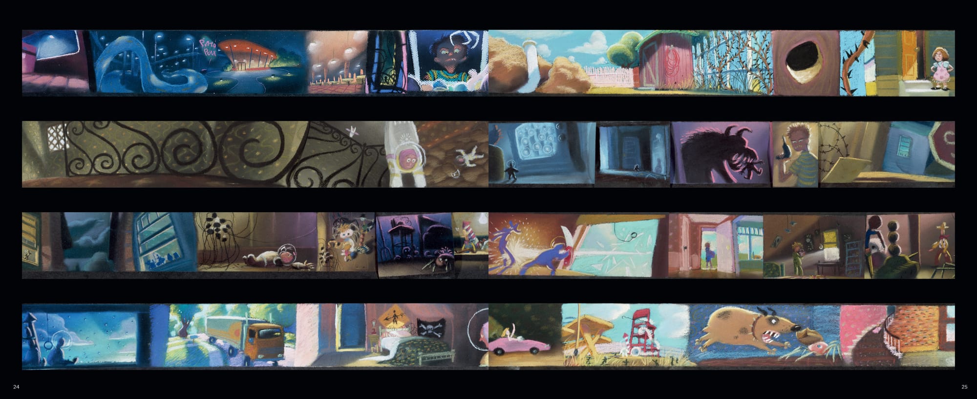 Lou Romano’s digitally produced color scripts for The Incredibles (2004) and Up (2009), are a delightful contrast to Eggleston’s pastel work. Though The Incredibles would be Pixar’s first film to have human protagonists, Romano doesn’t put much emphasis on the fact, instead employing abstract, geometric shapes and zingy colors inspired by ‘60s pop art. The landscape format of the book is most appreciated here, allowing color changes to sweep across the page In Up, as well, the wide formatting is a plus, as the heart-wrenching opening sequence unfolds across each spread, beat by emotional beat. Much like in the film itself, words aren’t needed to express the story there.