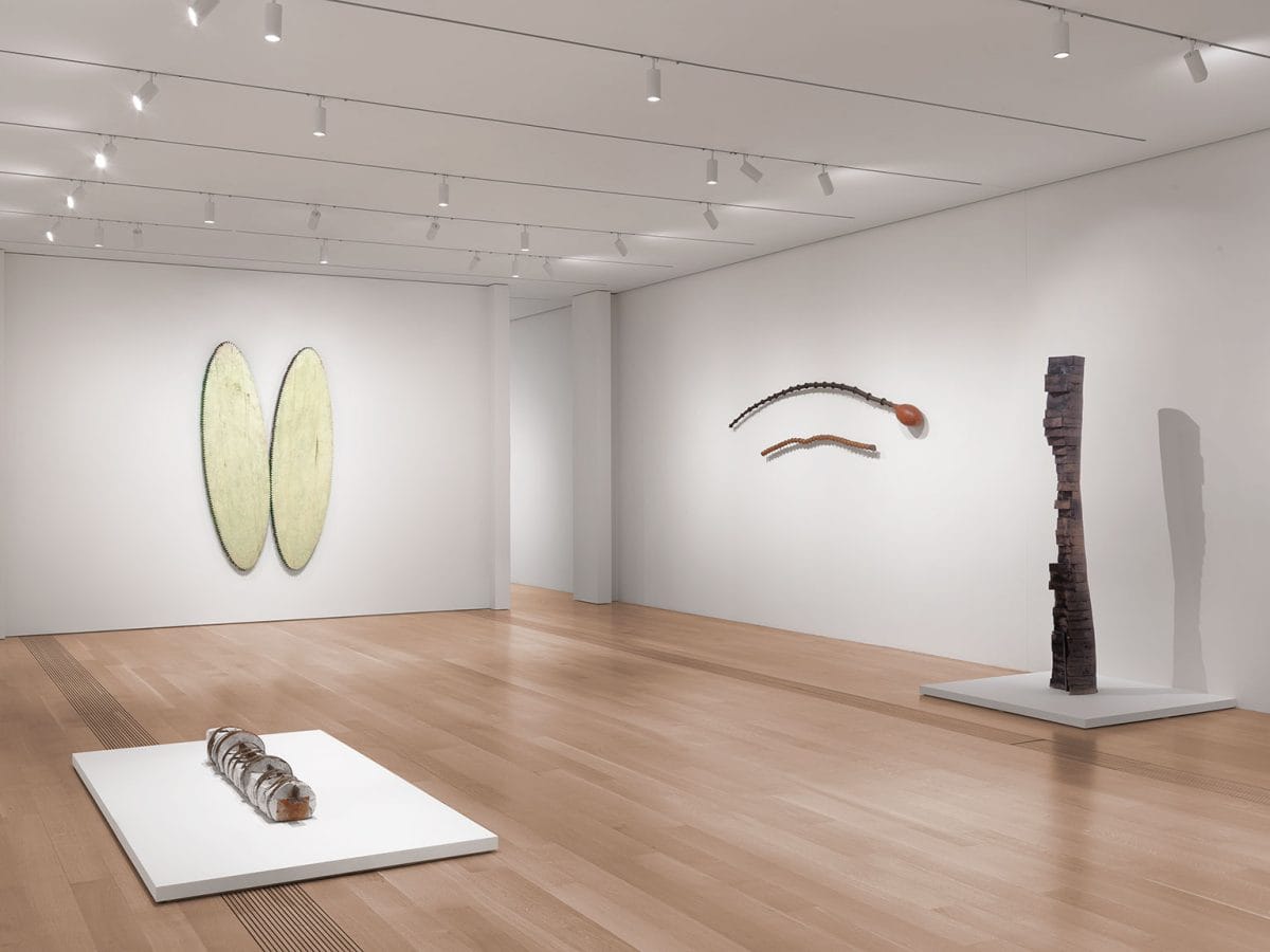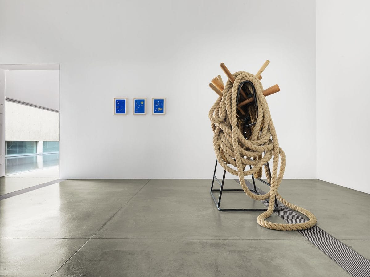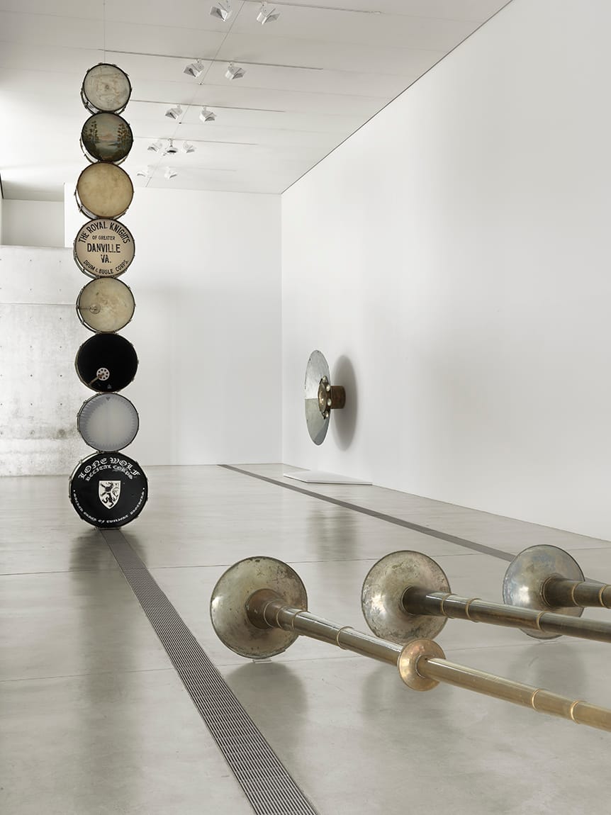 Featuring over forty artworks spanning Adkins’s career, as well as books and instruments from his personal collection, the exhibition foregrounds the artist’s lifelong engagement with music, language, history, and African American culture. Working between New York and Philadelphia until his death in 2014, the artist became known for staged multimedia performances with the Lone Wolf Recital Corps, a performance collective he founded in 1986 that included artists such as Sanford Biggers, Kamau Amu Patton, and Charles Gaines. Termed recitals, these performances explored the untold stories of underrepresented figures in African American history, while incorporating Adkins’s latest artistic creations. The exhibition features many of his most monumental sculptures, including “Last Trumpet” (1995), composed of four 18-foot-long brass horns — “arkaphones” — and “Muffled Drums” (2003), a soaring stack of eight bass drums.