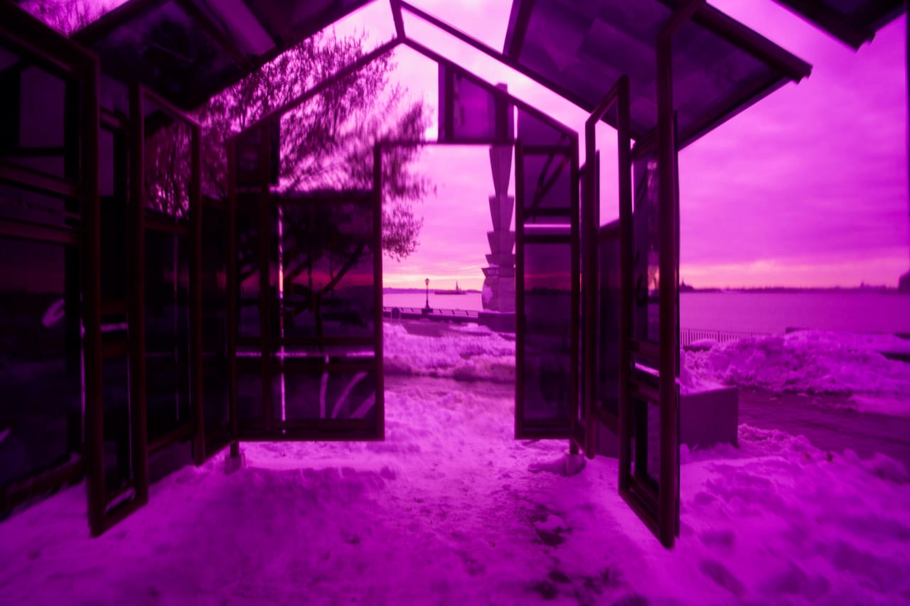 "The House That Will Not Pass For Any Color Than Its Own" is an interactive glass house-sculpture that three or four people may enter at one time. The purple glass panels that make up the structure are partially mirrored, allowing those inside to see themselves reflected in a different hue. The house is specifically positioned in a waterfront location that guides visitors to view the Statue of Liberty through its threshold and within.