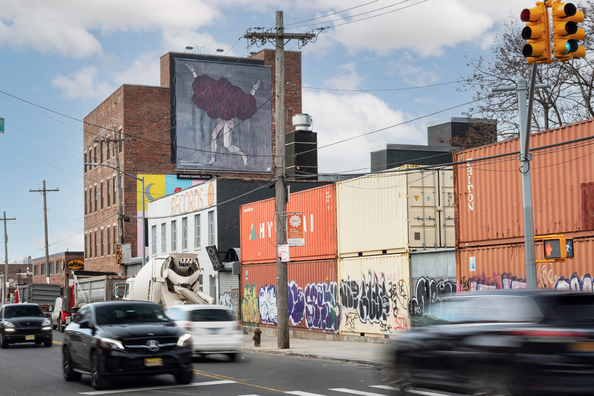 Vibrating with bold color, abstractions by Theresa Chromati and Ilana Savdie each teem with movement, suggestive of many shifting limbs. Chromati’s swirling, fragmented figures assert a changing sense of self while Savdie, born and raised in Barranquilla, Colombia, references the Marimonda figure prominent in the city’s carnival celebrations. Their fluidity echoes the moving street and the broader world in flux. Many of the billboards become portals, toggling between the everyday and the surreal, towards what Jahmal himself has described as a “kind of filtered realism.” Fittingly, Felipe Baeza’s “Unruly Suspension” (2020) features a levitating cloud-like figure whose dangling threads peek above industrial Bushwick structures.
