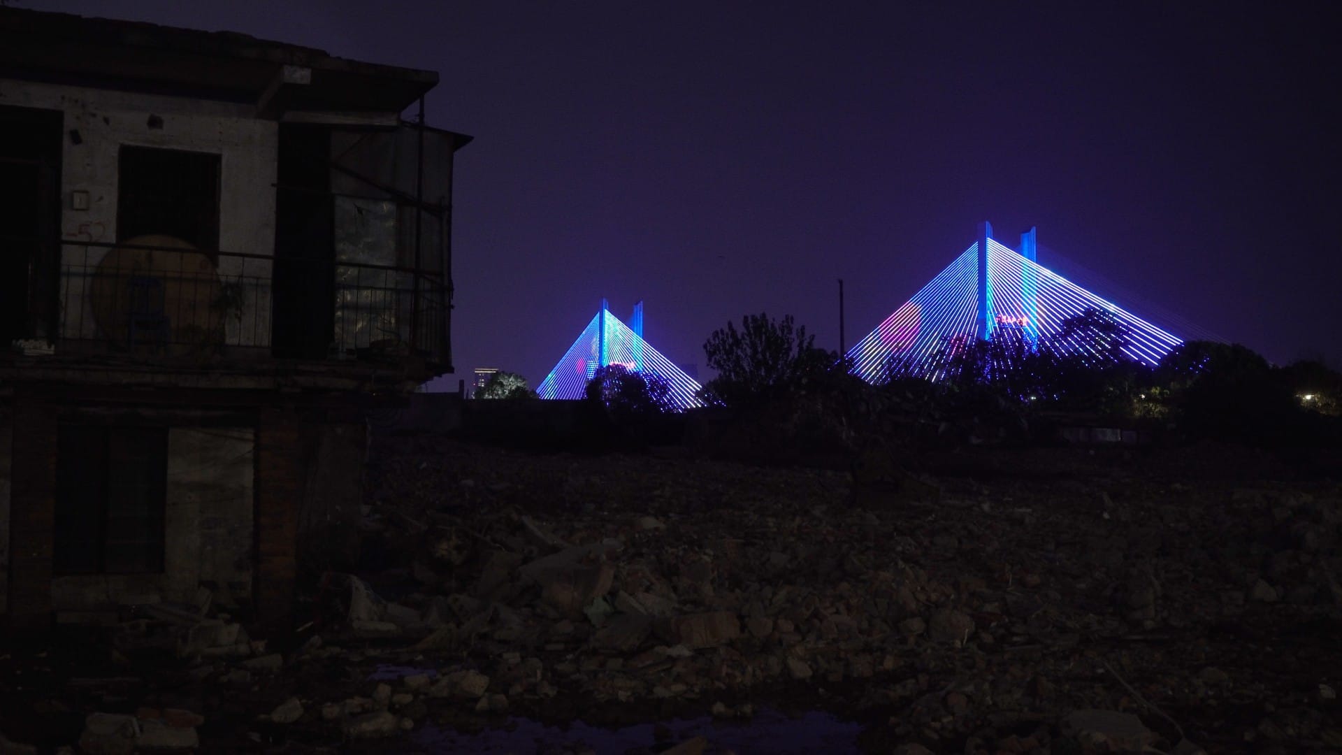 Through each composition, A River Runs, Turns, Erases, Replaces shows heterogeneous scenes of everyday life along the banks of the Yangtze. People take a dip, walk their dogs, dance to a Chinese riff on Auld Lang Syne, or assemble to watch a light show projected over the skyline at night. To counterpoint those quotidian occurrences, other sequences document the relentless urbanization. The cityscape is peppered with excavators plunging their buckets into the soil, while engineers look like tiny birds perched on the enormous scaffolding. When Zhu started filming in 2016, at first she simply used her smartphone. “The river site is enormous,” she remembers, “so there were many locations I had never been to.” These prolonged explorations not only helped her draw and retrace a morphing map of the city, but also connected her to the core of her film: “Gradually, I realized I was deeply interested in the concept of a transient space, and I started to look for all those places that are about to either be renovated or disappear.”