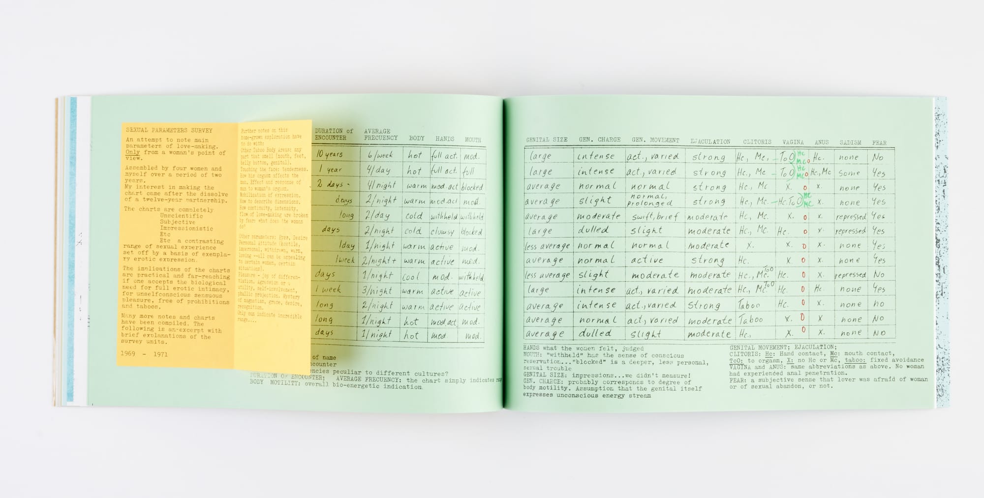 Parts of a Body House Book is both a catalog and artist’s book, and an argument for self-documentation.The volume includes essays, scores, sketches for expanded cinema and kinetic theater projects, letters, snippets of dialog, a recipe (from her work “Americana I Ching Apple Pie”), and even data from a two-year long ethnographic research project, comparing women’s self-reported sexual responses to different partners’ love-making approaches.
