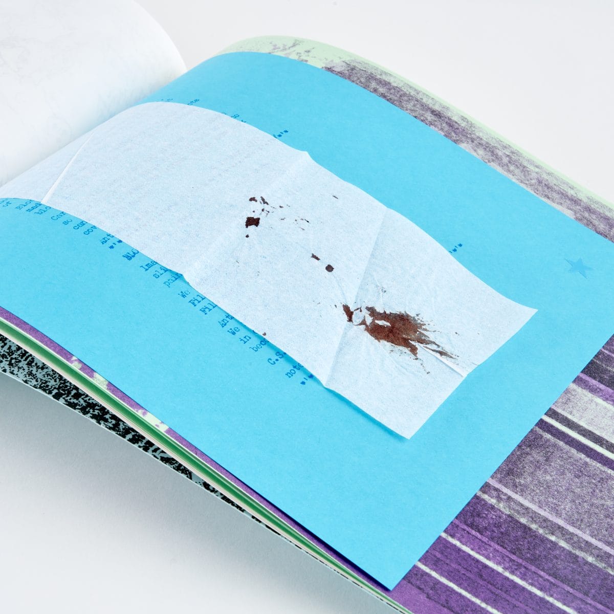 With no page numbers, or even a static orientation, our role as readers of this book involves constantly turning and flipping, and holding it up very close to our faces to look at tiny, blurry details. Sometimes those details reveal themselves to be traces of bodily fluids, increasing the visceral nature of the experience..