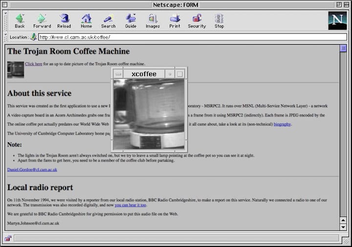 Emtage is among the creatives not widely known but who take responsibility for tools we still use today. 64 Bits also highlights the work of graphic designer Susan Kare, who conceived of visuals such as the original Mac icons, the MacPaint interface, and the artwork for the playing cards of Windows Solitaire. As for our webcams, credit is due to caffeine-starved students at Cambridge University’s Computer Laboratory. In 1993, Daniel Gordan and Martyn Johnson set up a web browser where they live-streamed the feed from a camera centered on a coffee pot to avoid wasting time on disappointing journeys to an empty pot.