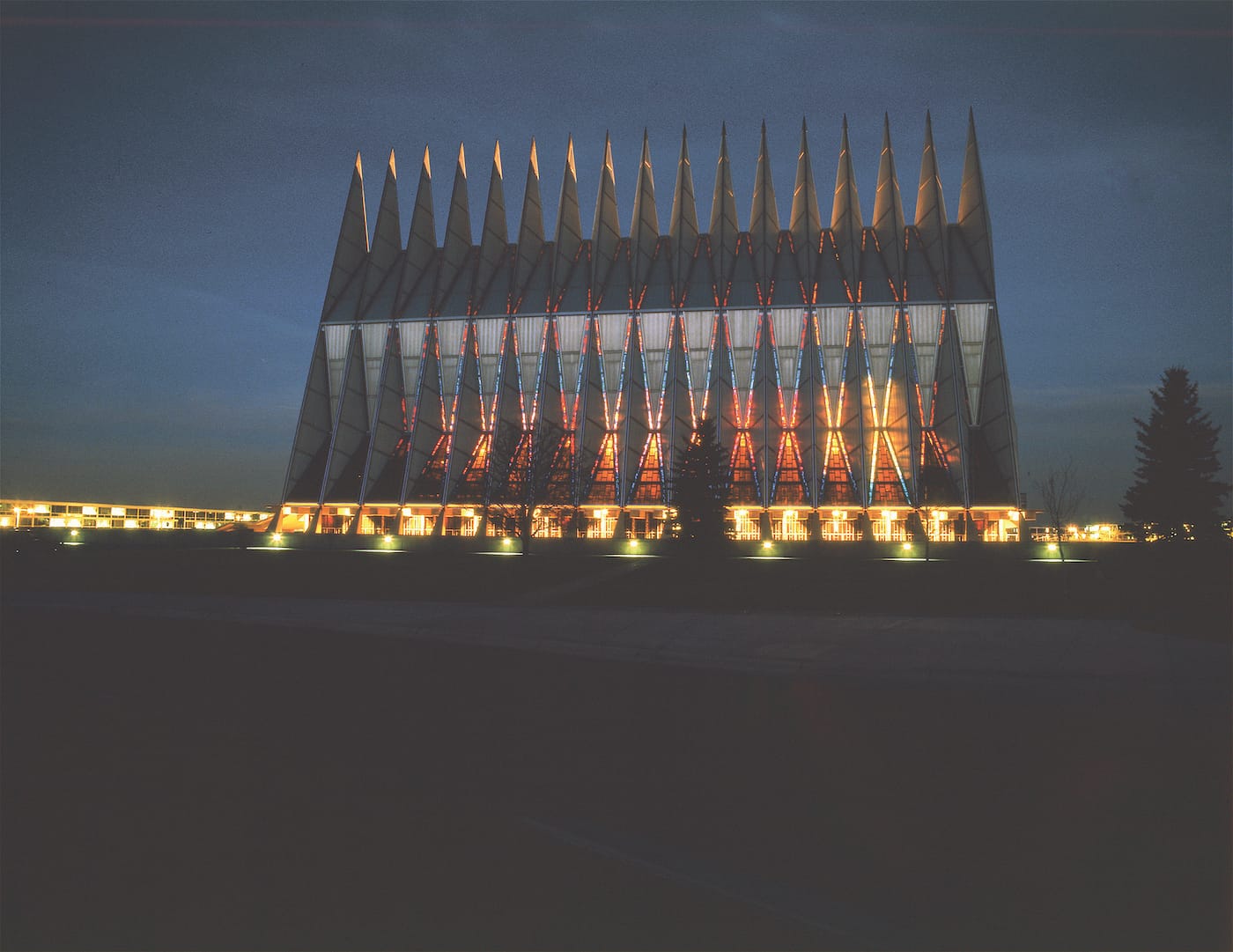 By the 1920s, the studio had transitioned to making fully-fledged modernist windows, such as for Frank Lloyd Wright’s Ennis House and Hollyhock House, the only UNESCO World Heritage Site in LA. At the museum, you can see an actual window from the Ennis House, glowing in front of an LED light. This is followed by one of Judson’s largest projects: the Air Force Academy Cadet Chapel in Colorado Springs, completed in 1962, a modernist church designed by SOM composed of 24,000 slabs of colored, faceted glass. “I love this building,” Fishburne told me during a recent visit to the show, “It's like someone said, ‘make me a Gothic cathedral but for Star Wars.’” Plagued by leaks virtually since its construction, much of the Judson team is in Colorado working on an extensive restoration project.