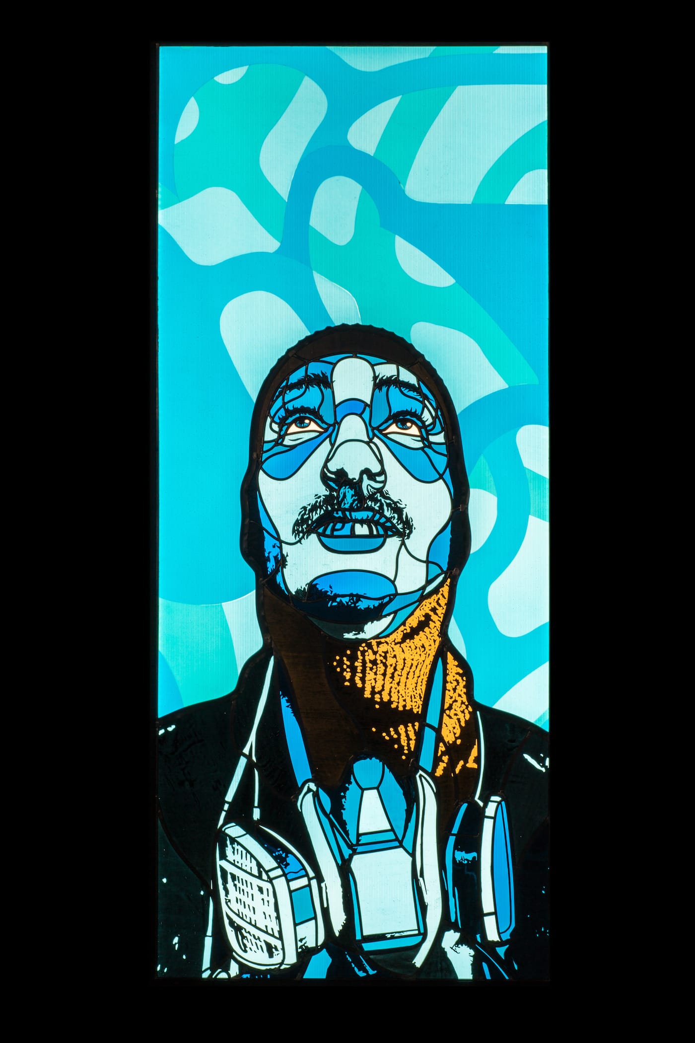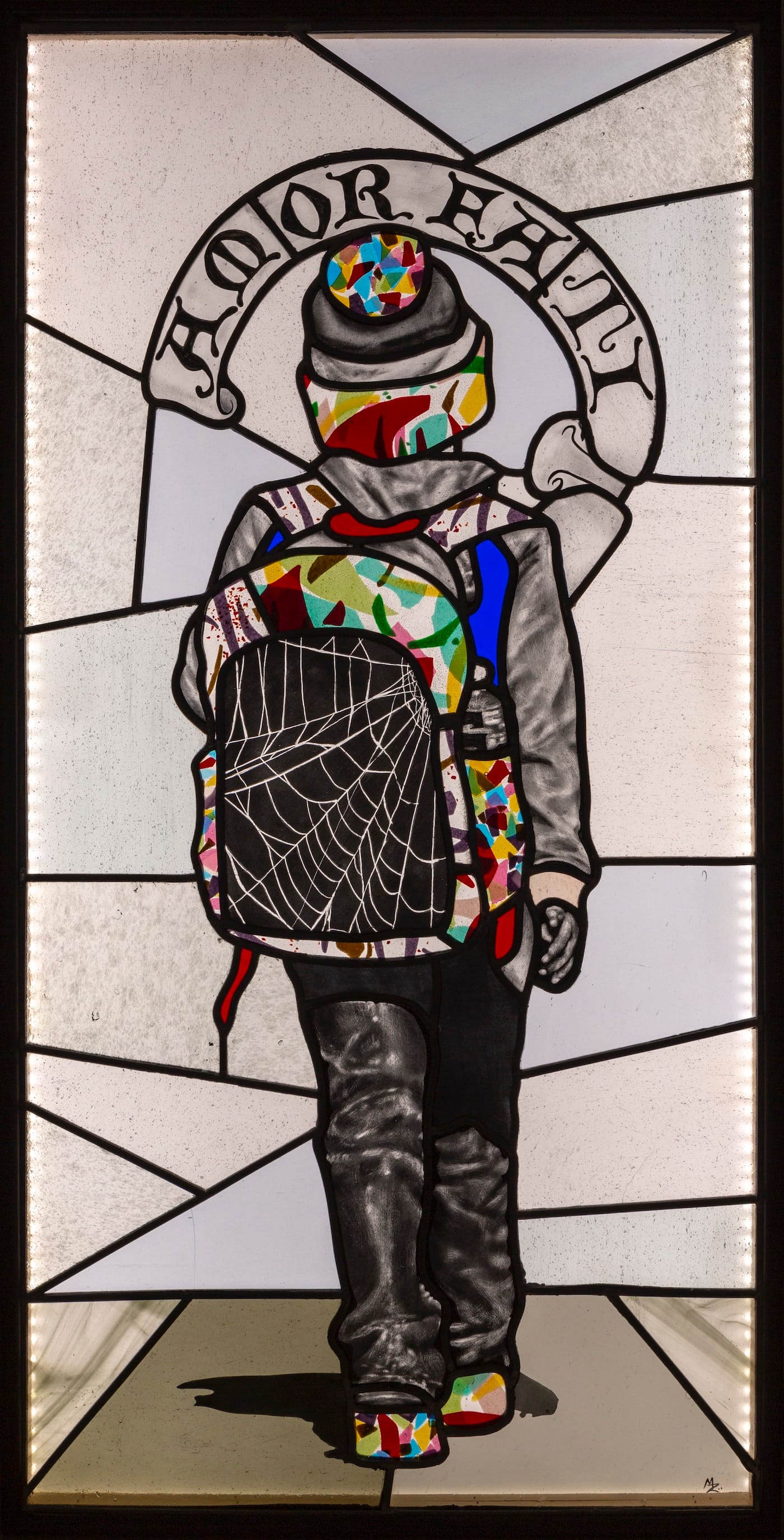 The final section of the exhibition is devoted to contemporary artists who have recently worked with Judson to create artworks that expand the possibilities of art glass. Several of these are street artists, whose work traditionally covers a wall, appealing to those on the exterior of a building, similar to the way stained glass enhances the experience of those inside. “Amor Fati” by Marco Zamora depicts a childdressed in contemporary clothesfrom the back, the titular phrase spelled out above him in gothic letters, a nod to both stained glass’ medieval origins as well as the gothic script favored by Latinx graffiti and tattoo artists. David Flores’s “The Muralist” is a self-portrait depicting the artist looking up in reverence or anticipation, perhaps at the new wall he is about to tackle, a respirator hanging from his neck.