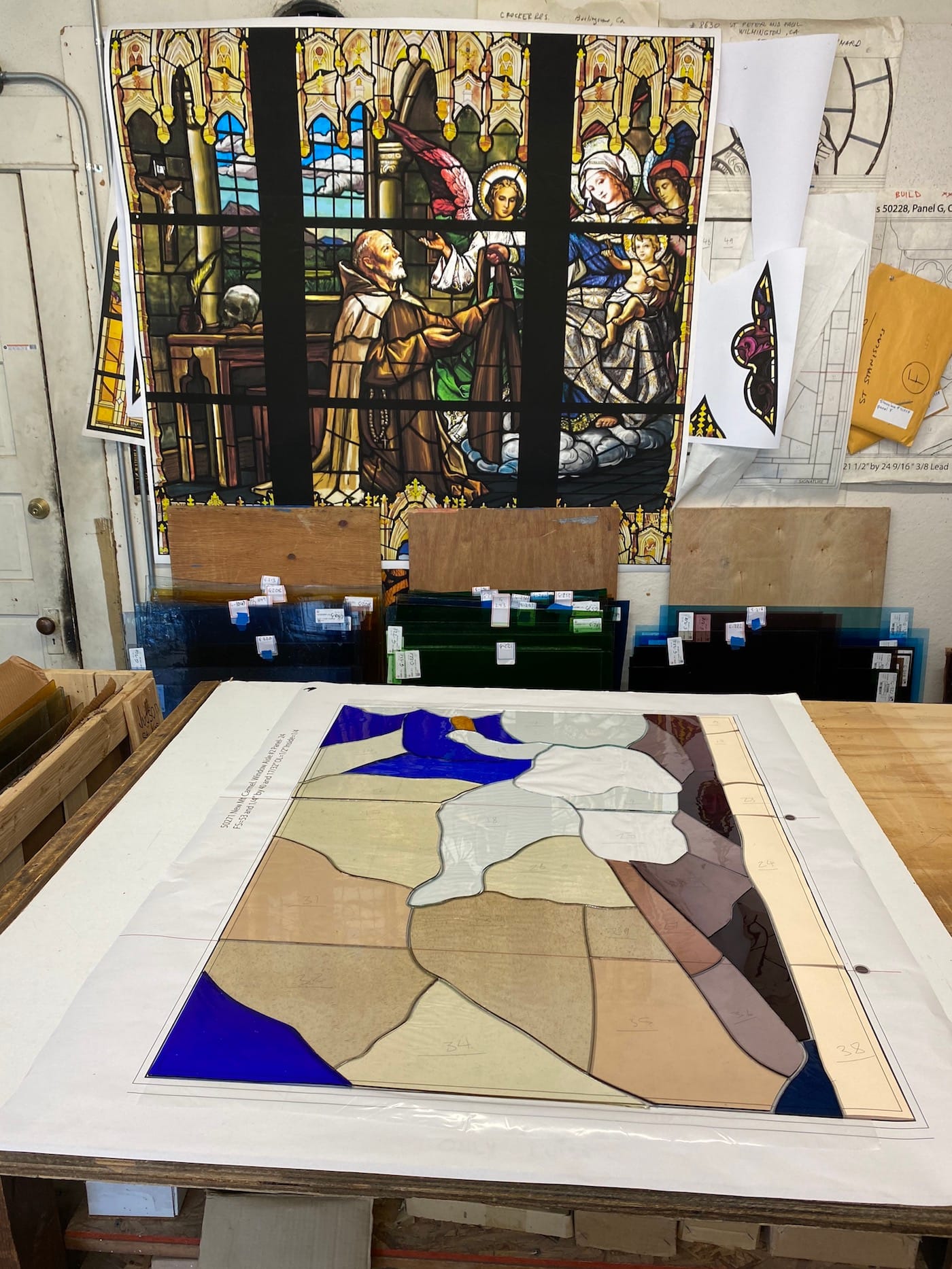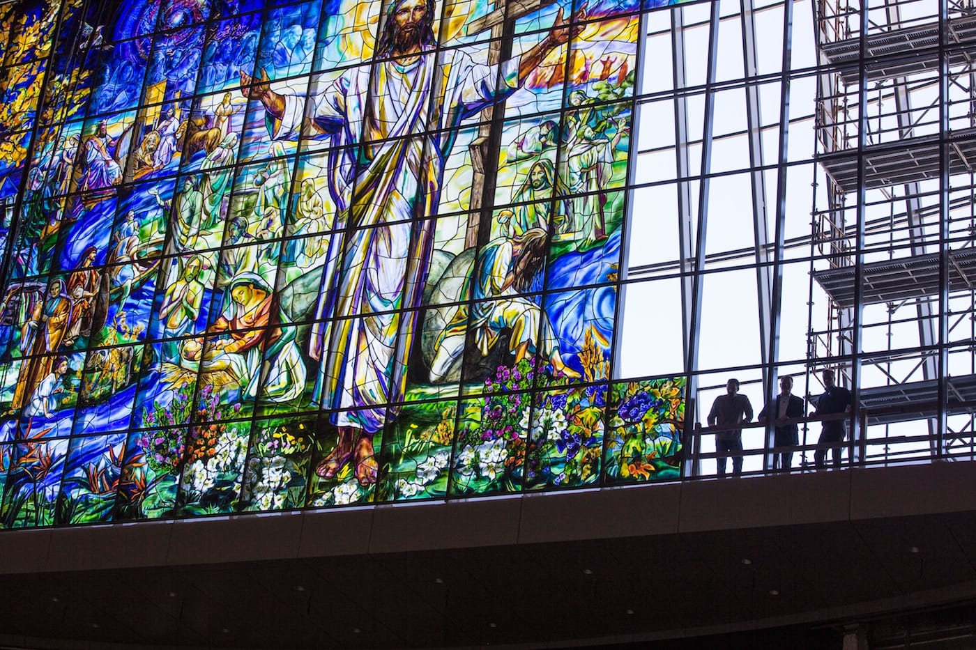 Another major turning point for Judson came in 2018 with the Church of the Resurrection in Leawood, Kansas. It features the world’s largest fused glass window, with 161 panels totaling more than 3,400 square feet of art glass, and marks the studio's expansion into fused glass. The stained glass process begins with a paper design, followed by cutting sheets of colored glass into desired shapes and painting details onto the glass pieces, which are then fired. The pieces are fit together using lead or copper strips and finally “cemented” or covered in a waterproof putty. Fusing, however, involves attaching two different pieces of glass in a kiln to “fuse” them together, without lead in between the pieces. In order to embark on the Church of the Resurrection project, Judson built an entirely new studio just blocks from their old one, and brought on the “godfather of fused glass,” Narcissus Quagliata, to assist them with the project.