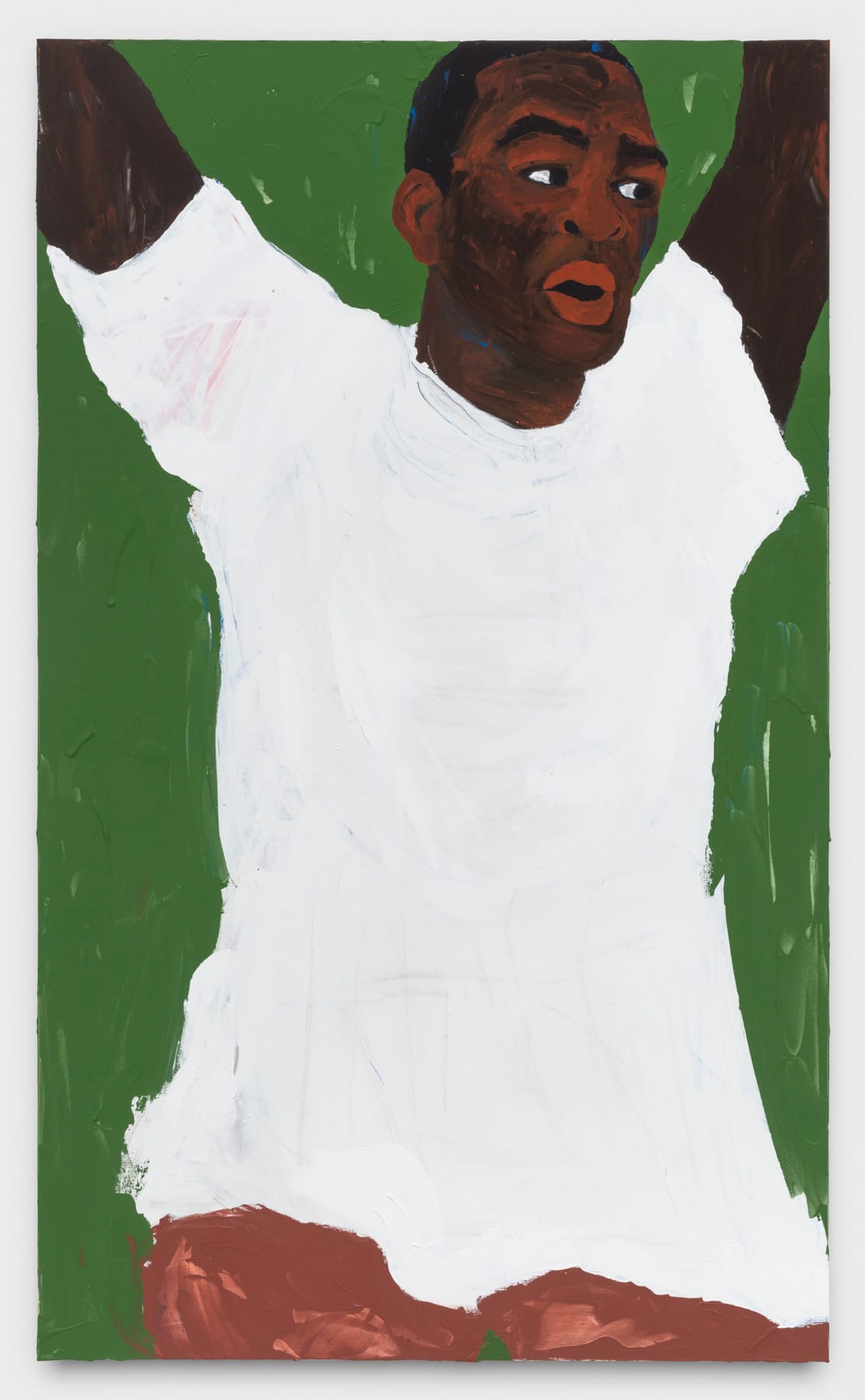 A series of six separate paintings show dark-skinned black men in white, loose-fitting t-shirts and variously colored pants, their limbs splayed, against a background of solid blue or mauve or mustard; three more works show men from the chest up only. In all of these works, clear indications or sports are absent. Four of the paintings (“I Don’t Want to Wake You,” 2020; “Gone Before You Wake Up,” 2020; “To Change Now,” 2021; and “Left You Up, Waiting,” 2021) show the men with their arms raised. Is this a reference to someone shouting during a game — as in “Hands up, pass the ball!” — or the more dire “Hands up, don’t shoot”? Armstrong alludes to the ways signifiers shift in meaning depending on the context. These are not only Black athletes but also Black people experiencing the consequences of their Black-skinned bodies.