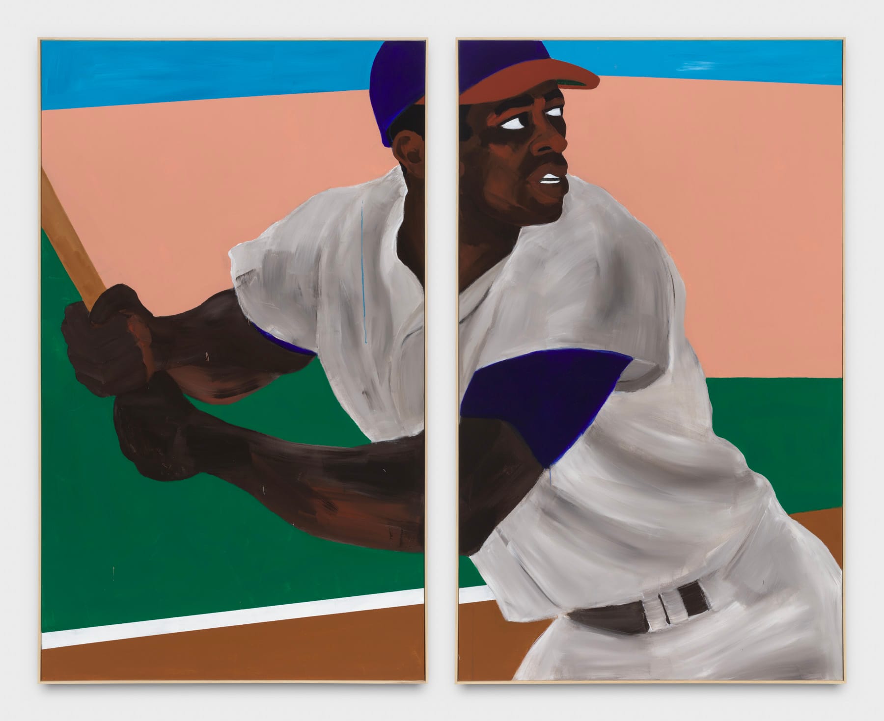 Armstrong explores this push and pull in another diptych,“Hammer in a Sea of Hate” (2021), which depicts legendary baseball player Hank Aaron (nicknamed “Hammer” or “Hammerin’ Hank”). The two panels divide a single image of Aaron at bat, separating the arms gripping the bat from the player’s face, which is focused on a point beyond our view. His torso, poised to swing, is also split. With his upper lip curled and eyes intently focused, he could be waiting for the pitcher or reacting to an all-white crowd shouting various epithets — a reality he faced as he came close to surpassing Babe Ruth’s home-run record.