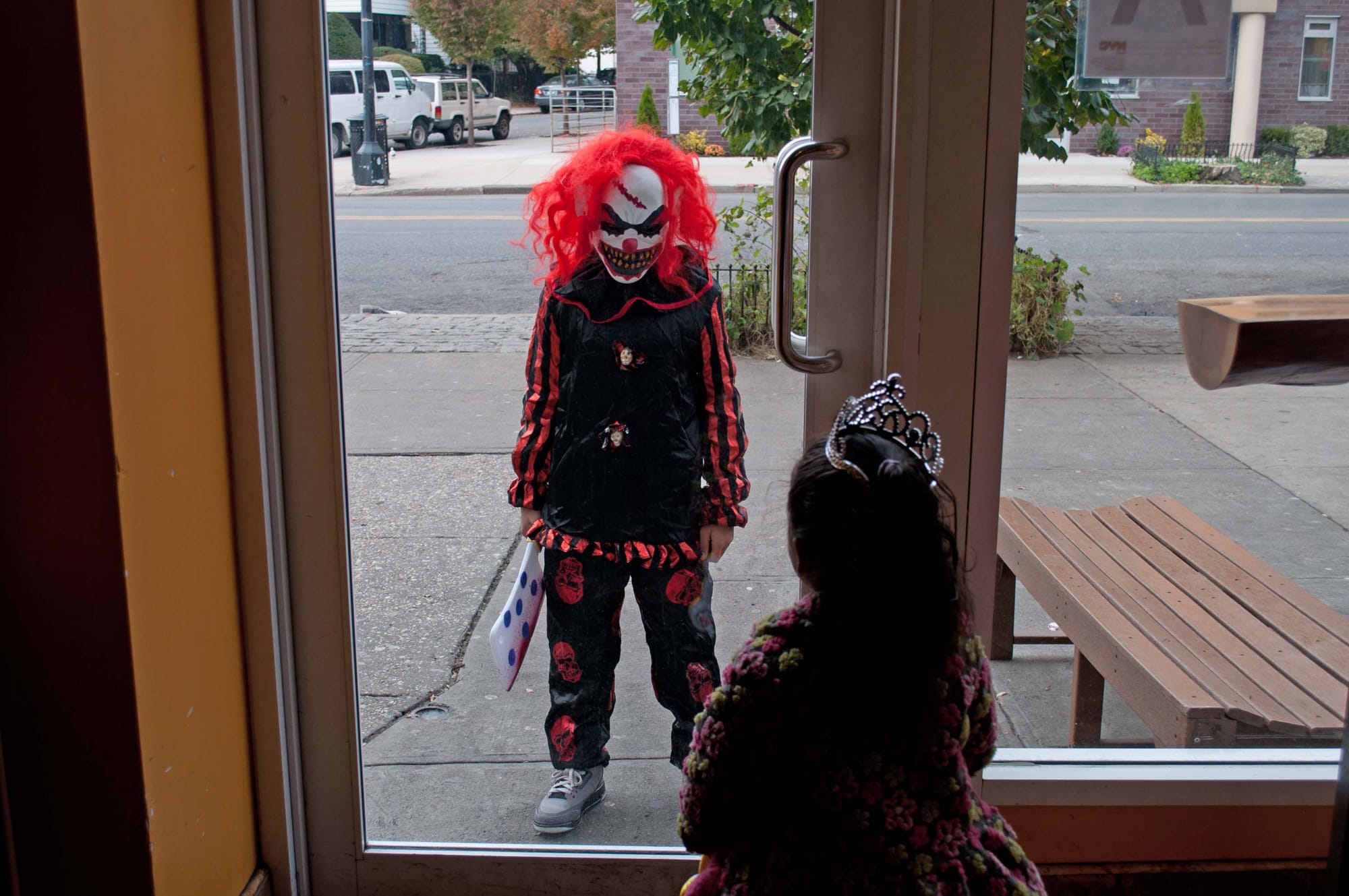 To speak of Faustine’s work as an idealized vision of life, however, would be incorrect. The exhibition toys with and deconstructs the classic childhood fairytale, particularly in reference to “The Two Queens,” Ming and Simmons. In “My Fears,” a young boy in a clown costume wields a spray-painted plastic machete, staring menacingly through a glass door at the young Queen Ming in her tiara. It is a dreamlike narrative set against the backdrop of everyday Brooklyn — a warning, in the guise of a fable, about the constant threats that young Black girls face.