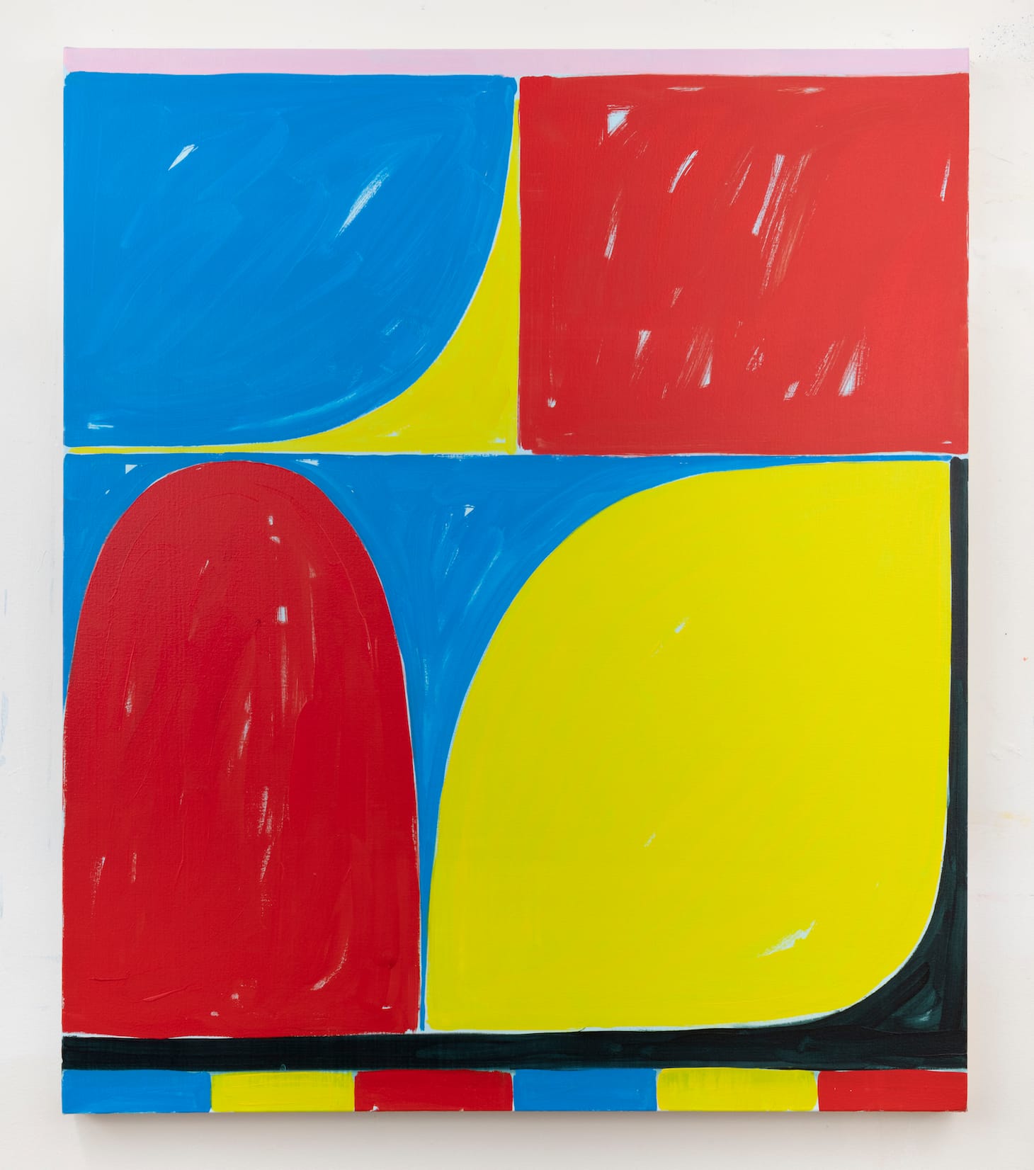 In the top half, Stopa divides the painting vertically into equal-sized sections. The right rectangle is loosely filled in with violet paint applied to a white ground, which peeks through. The left rectangle is mostly red, but a sky-blue section in the top right corner forms a triangle with a curved side that abuts the red area. The blue opens the painting up. A pale yellow line along the left edge mirrors the green on the right. The bands both divide the painting into distinct areas and become borders within the painting. This is where Stopa’s painterly intelligence comes through. Repetition is interrupted and the suggestion of a blue sky adds another dimension of meaning into the work.