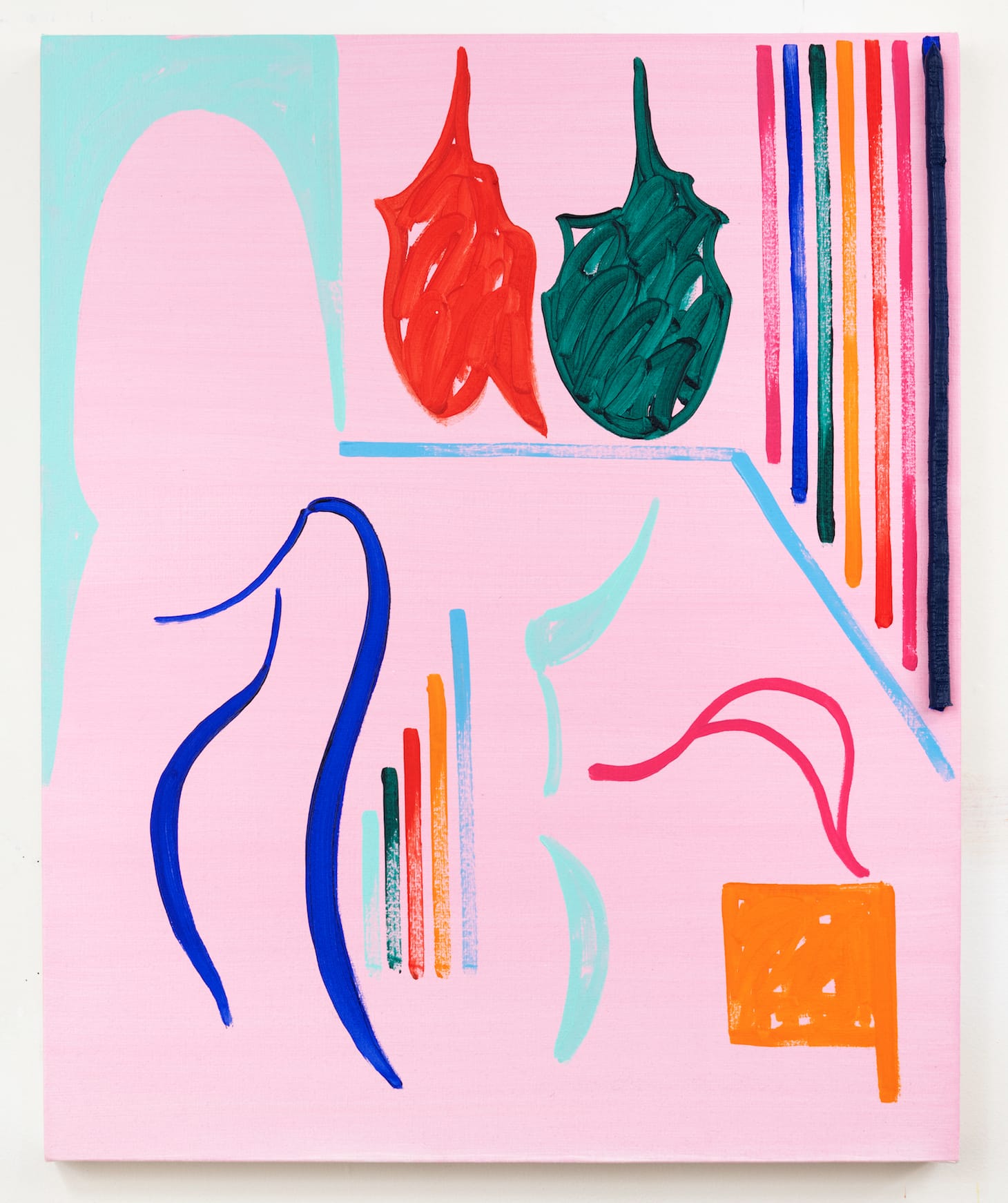 Saturated blue, hot pink, magenta, fire-engine red, butter yellow — Stopa applies his tropical palette to a monochromatic ground that ranges from bubblegum pink to pale yellow and blue, recalling a summer day. He tends to divide his compositions into an upper and lower world. In the bottom half, he might make a series of Xs running from side to side, reminiscent of a fence.